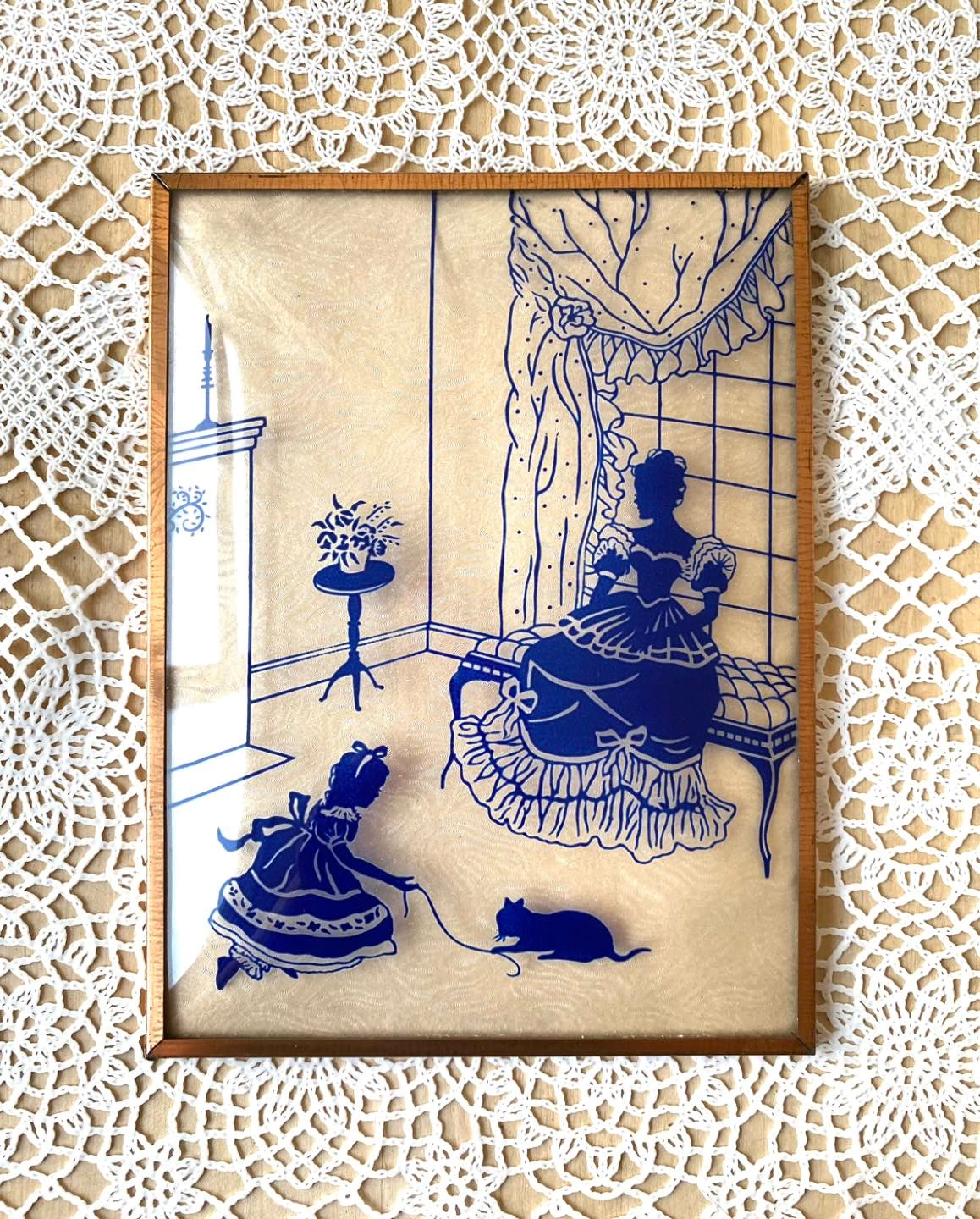 Rare vintage woman rest and child play with cat wall art. 15.3cm*20.5cm. Really beautiful piece and hard to collect! 🥰🥰