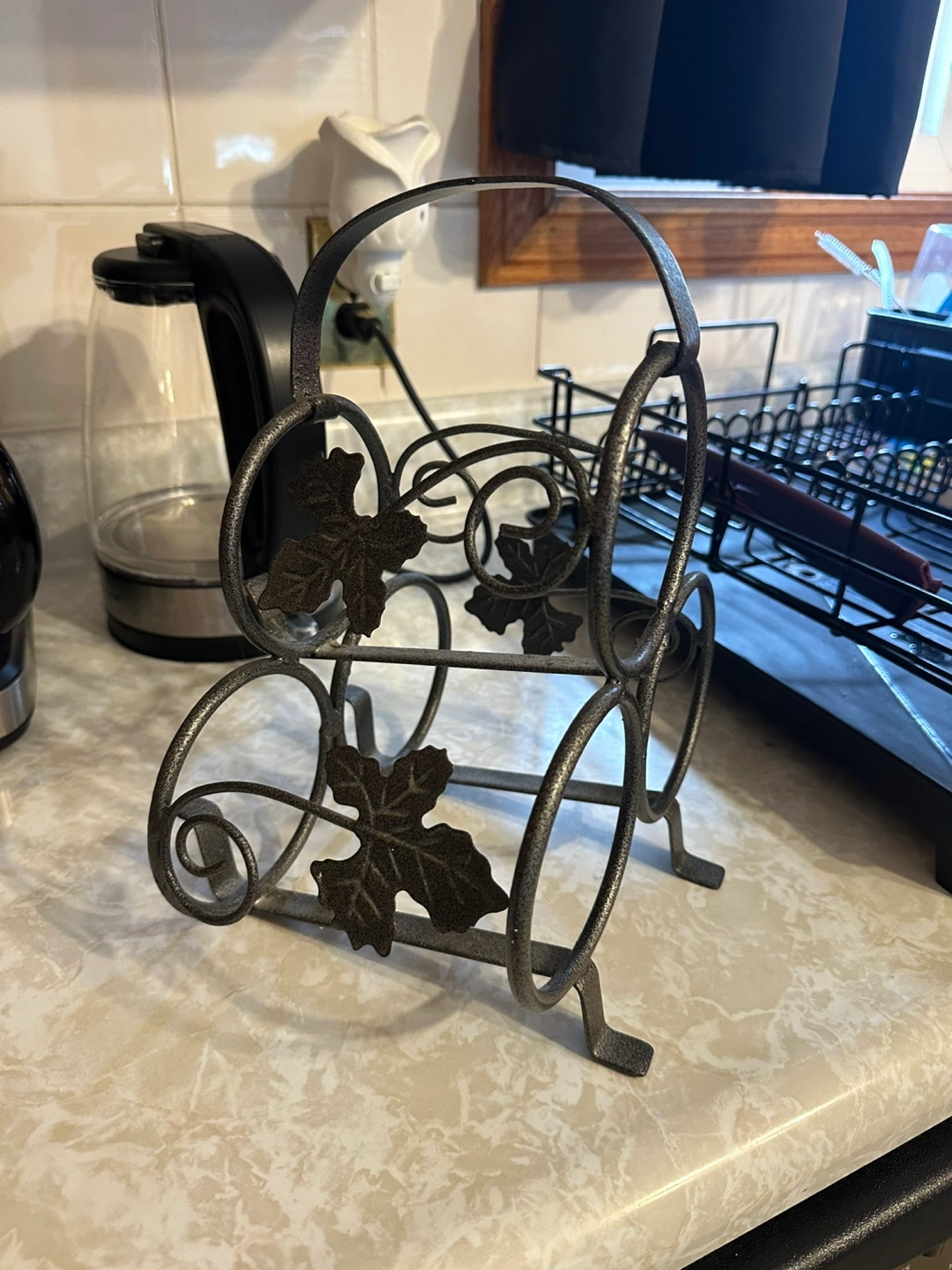 Here's a cute metal wine rack, perfect for displaying your favourite bottles! It has a lovely leaf design that adds a touch of elegance to any kitchen or dining area. It's in great condition and ready to find a new home