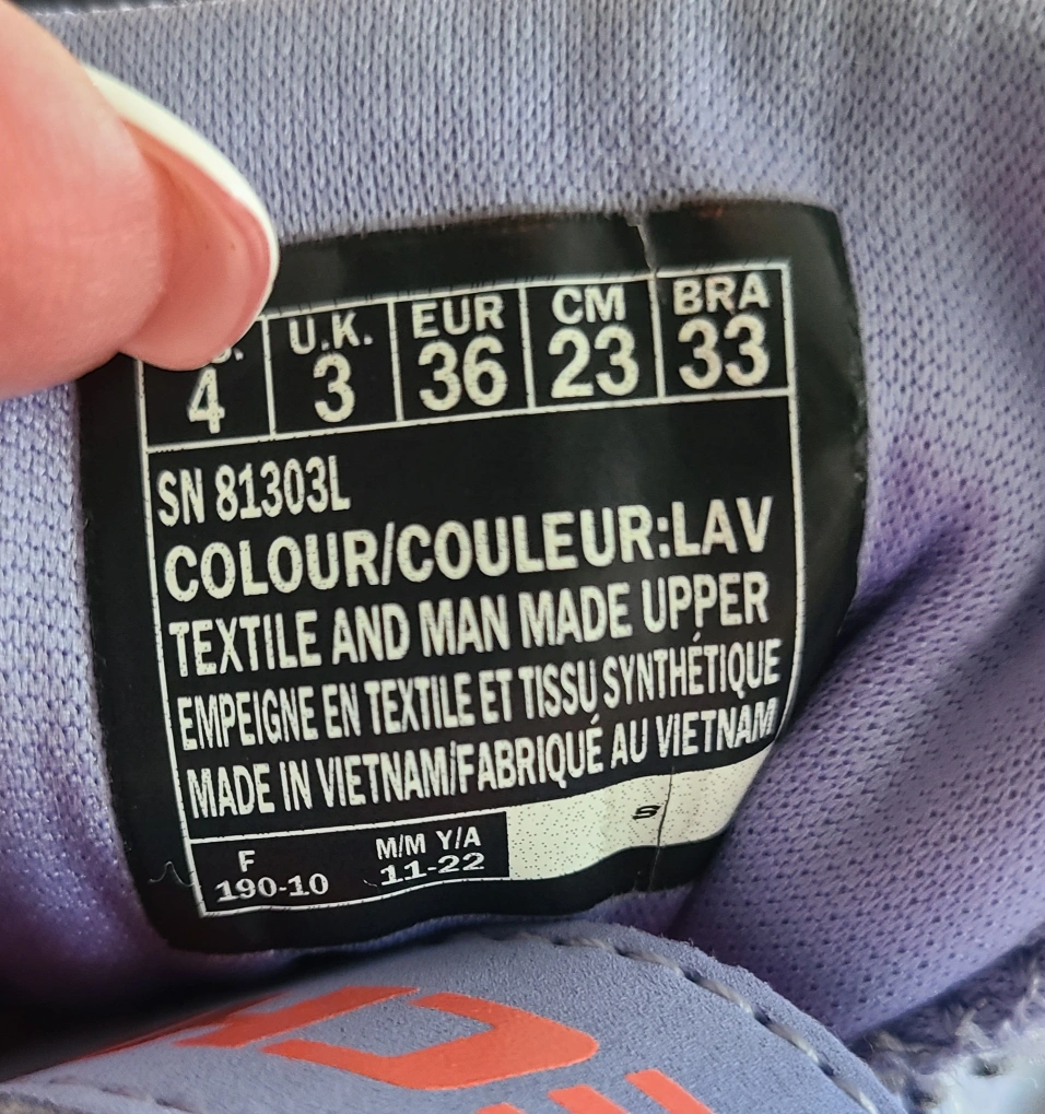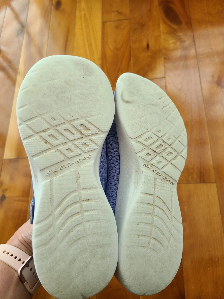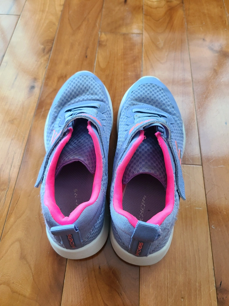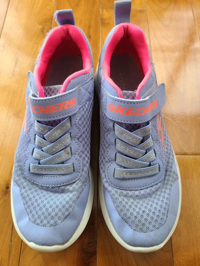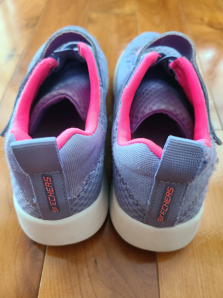 Selling a pair of Skechers kids' athletic shoes. They are a light purple colour with pink lining and Skechers logo. Size 4