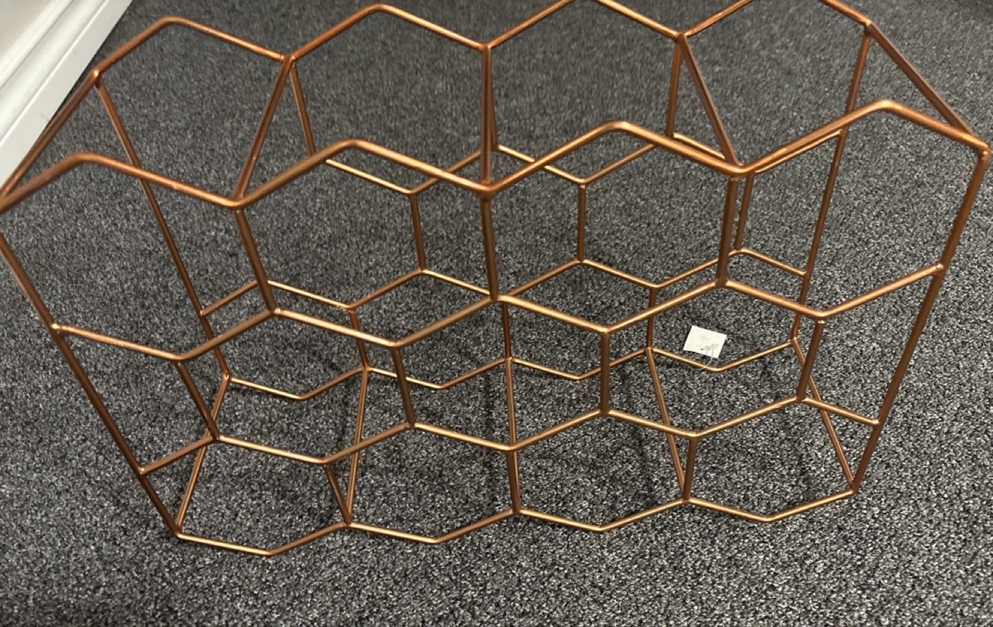 Here's a brand new stylish copper wine rack, perfect for adding a touch of modern elegance to your home decor. It's in great condition from Craft and Barrel. Ready to hold your favourite 11 bottles of wine! Pick up and cash only, please.