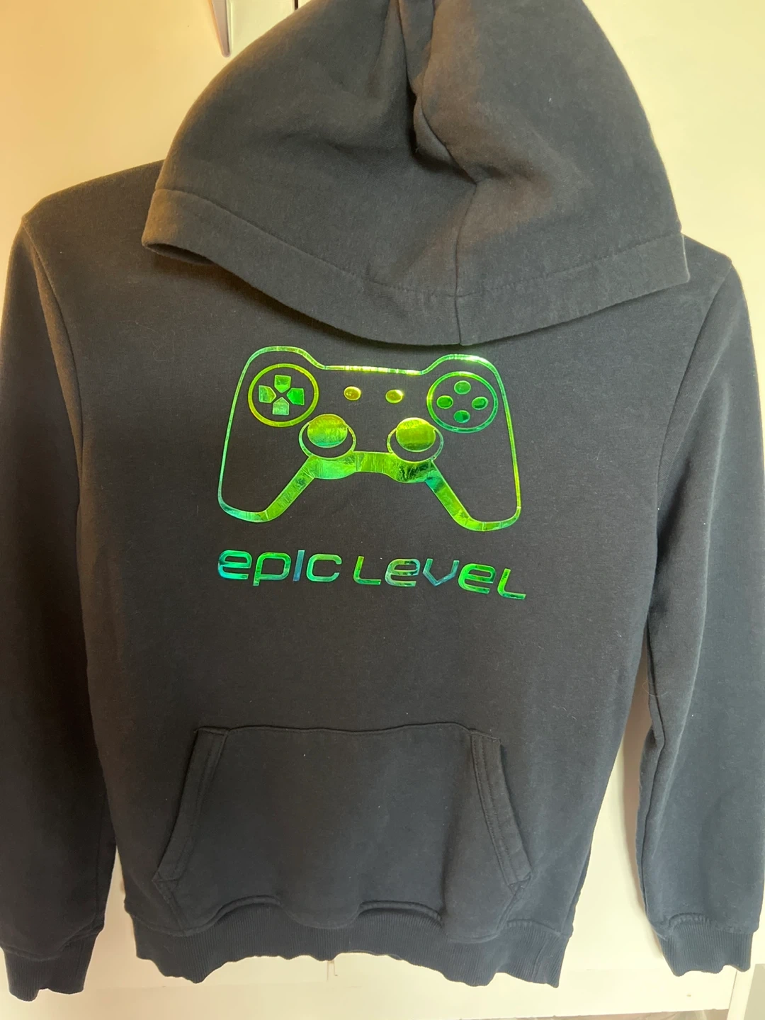 Selling a H&M black hoodie with an 'epic LEVEL' graphic on the front! It's in great shape and is a size 10/12. Perfect for any young gamer!