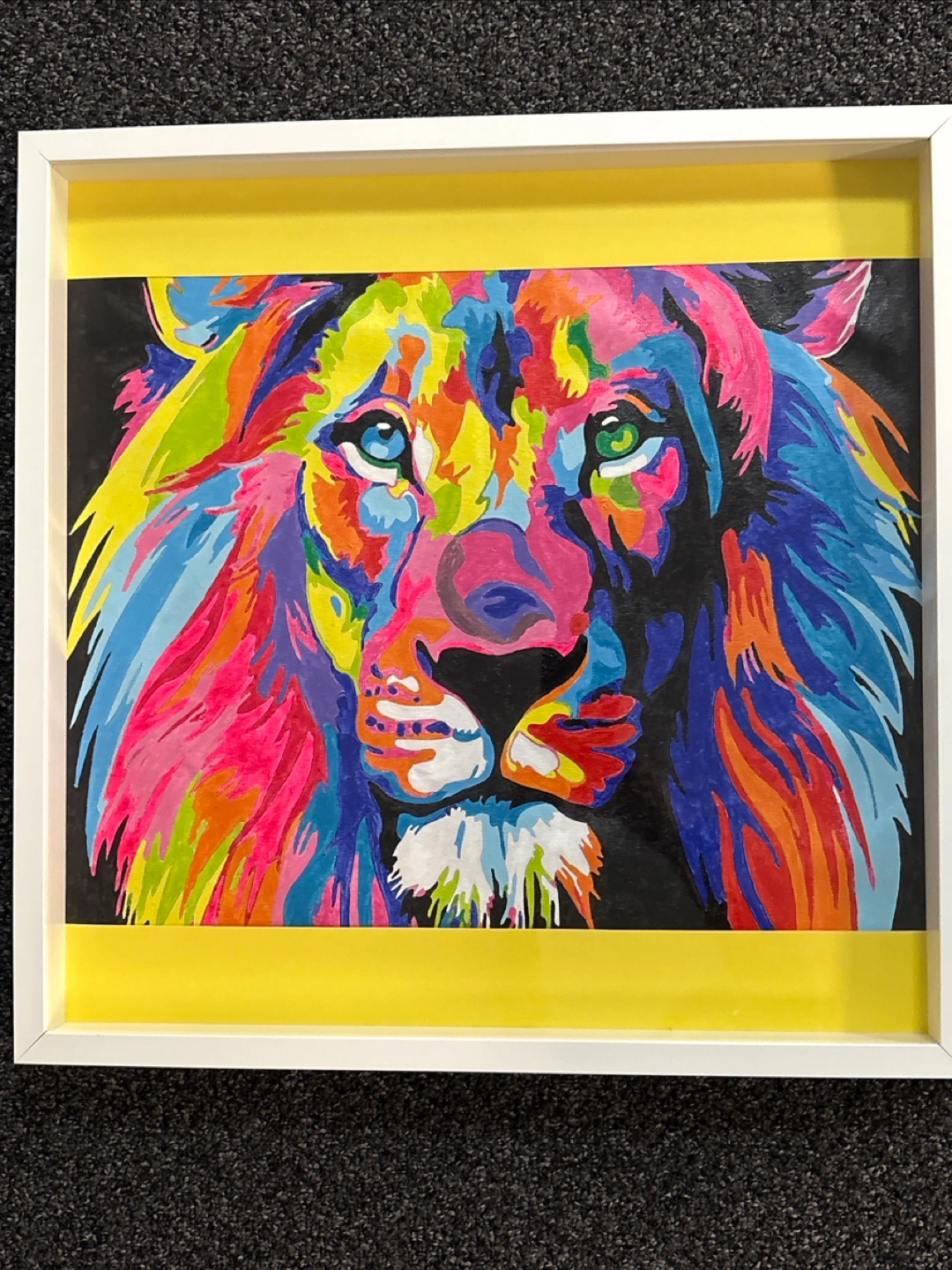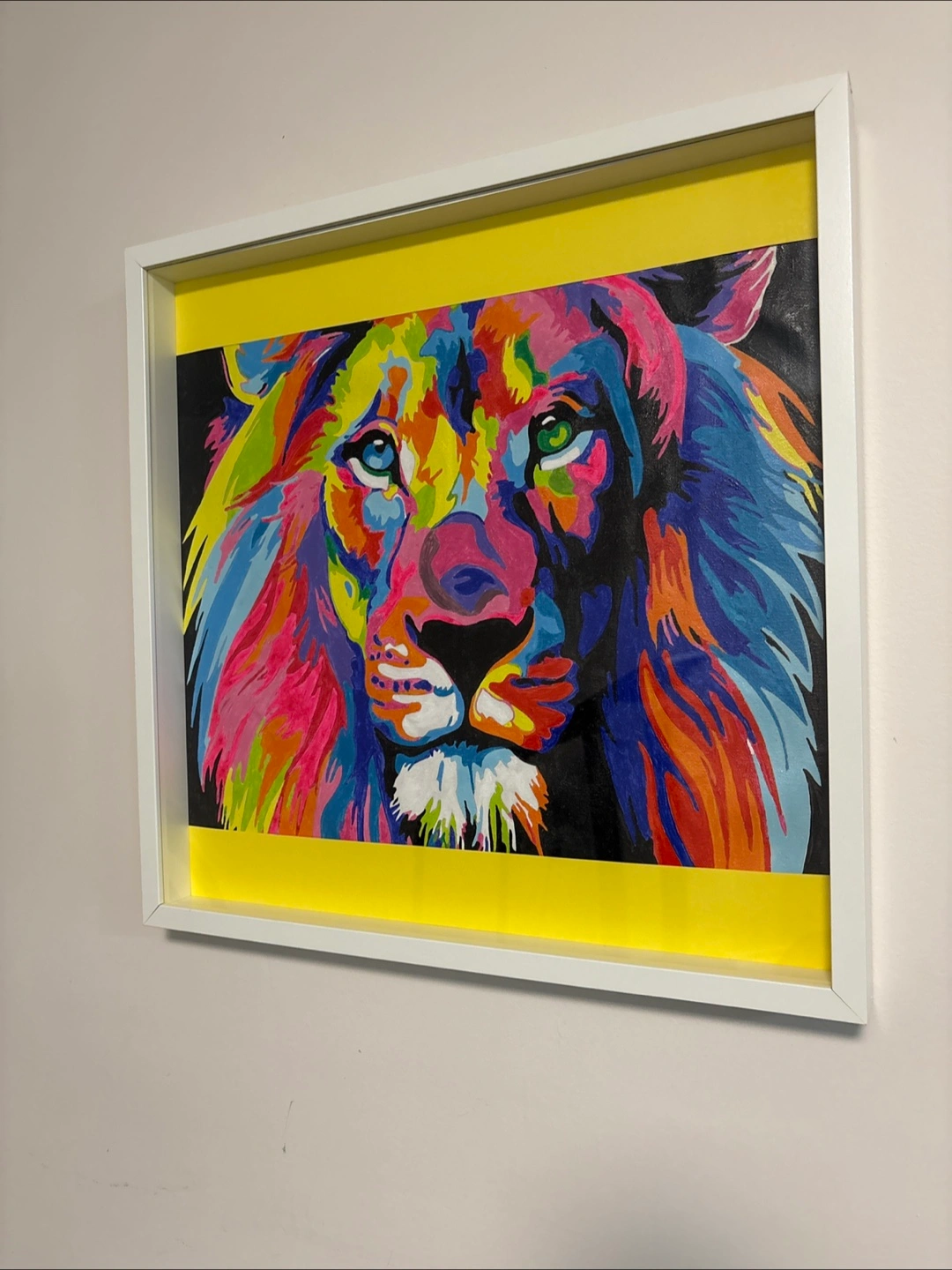 This vibrant lion art would be a great addition to any room! It's framed in a simple white IKEA frame, ready to hang and bring some colour to your space. 21 inches x 21 inches (53 cm x 53 cm) I may be able to meet closer to where you are. Cash only, please. Thank you.
