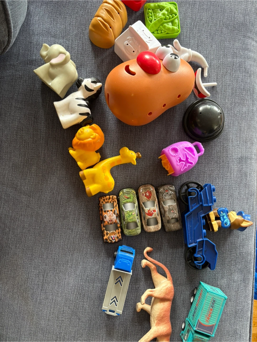 Selling a mixed lot of toys, including a Mr. Potato Head with accessories, animal figures, and toy cars. Perfect for a young child's playtime!