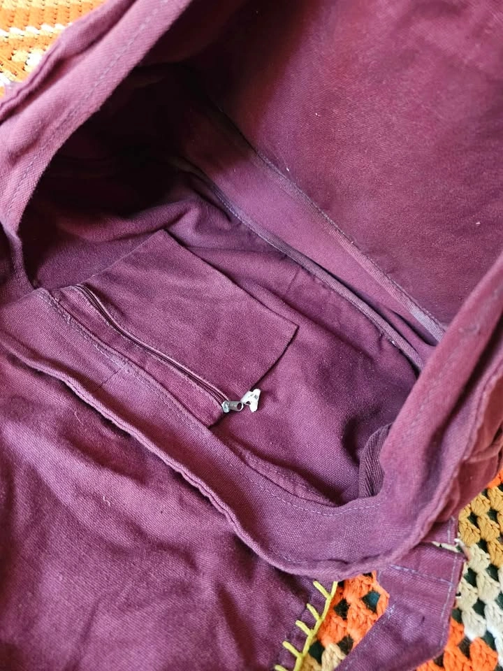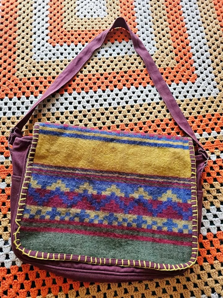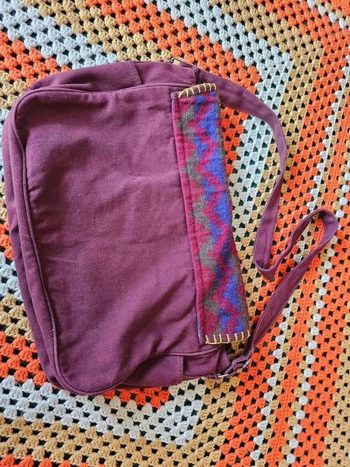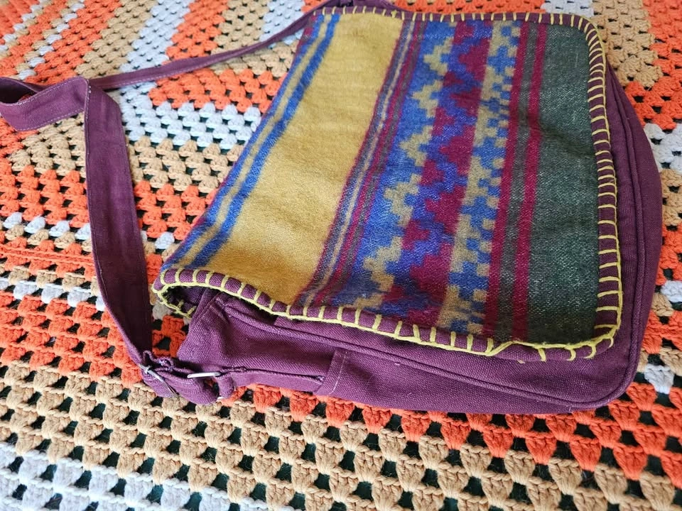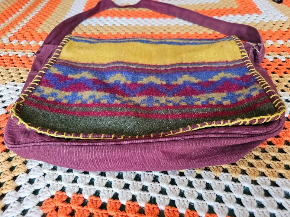 Made in India hippie/ bohemian style messenger bag, made of a thick plum purple/ burgundy/ brown woven cotton fabric. Bag has a woven front panel of a wool or wool-like fiber, with a bold pattern in muted earth tone shades of olive green, red, mustard yellow, and dark blue. Bag has one main compartment, one large front pocket, one inner zippered pocket, and small pockets on each side. The flap closes with velcro. Strap is adjustable and measures 41.5" when adjusted to its longest length. Bag measures about 17" long x 12" tall x 4" wide. Bag is in very good used condition. There are some minor flaws in the woven cotton that look like they have been there from the beginning, and a small area of discoloration at one inner corner inside of the main compartment.