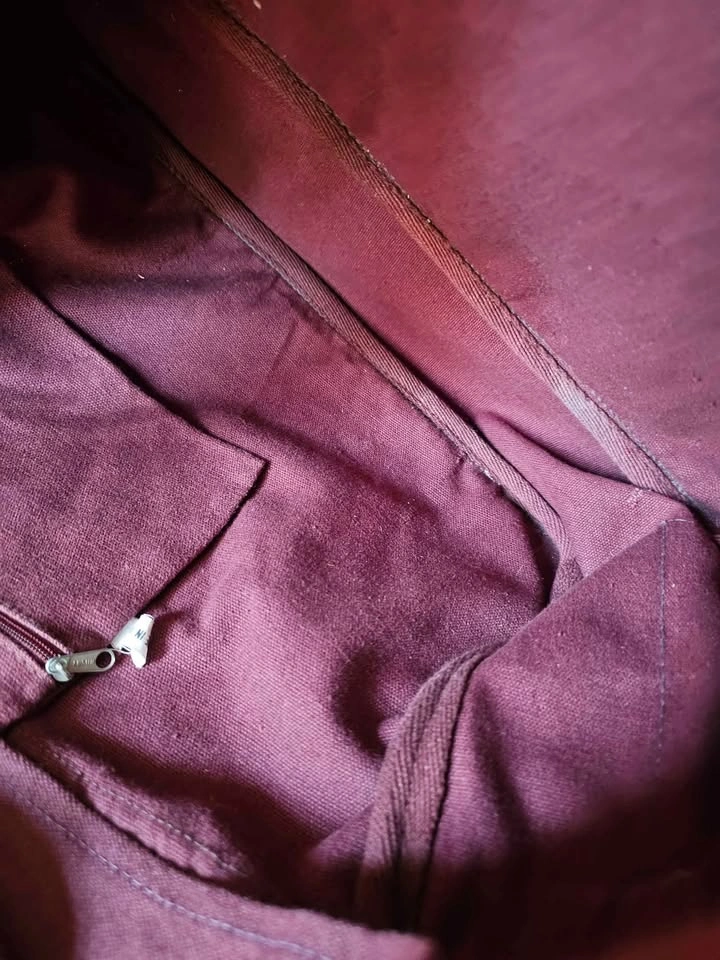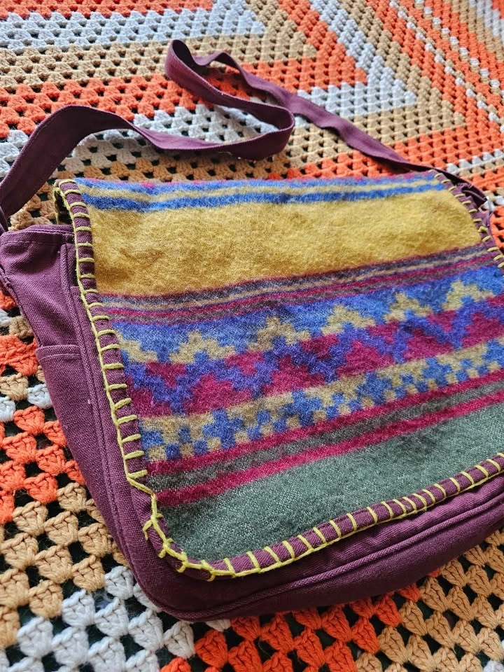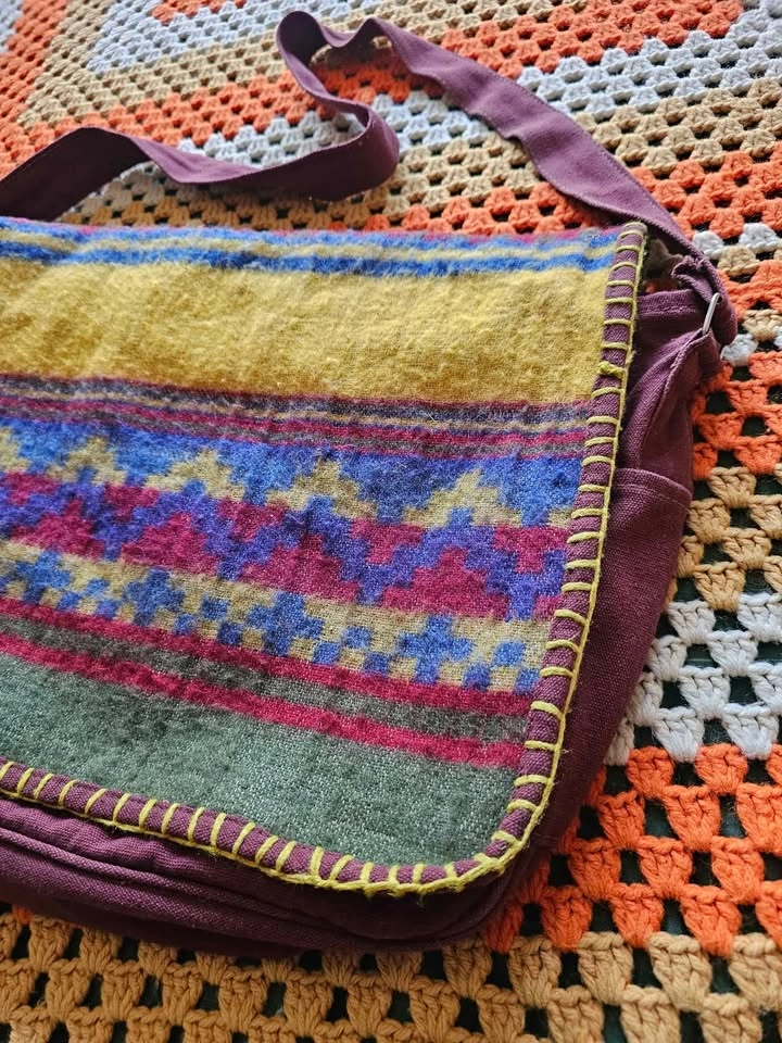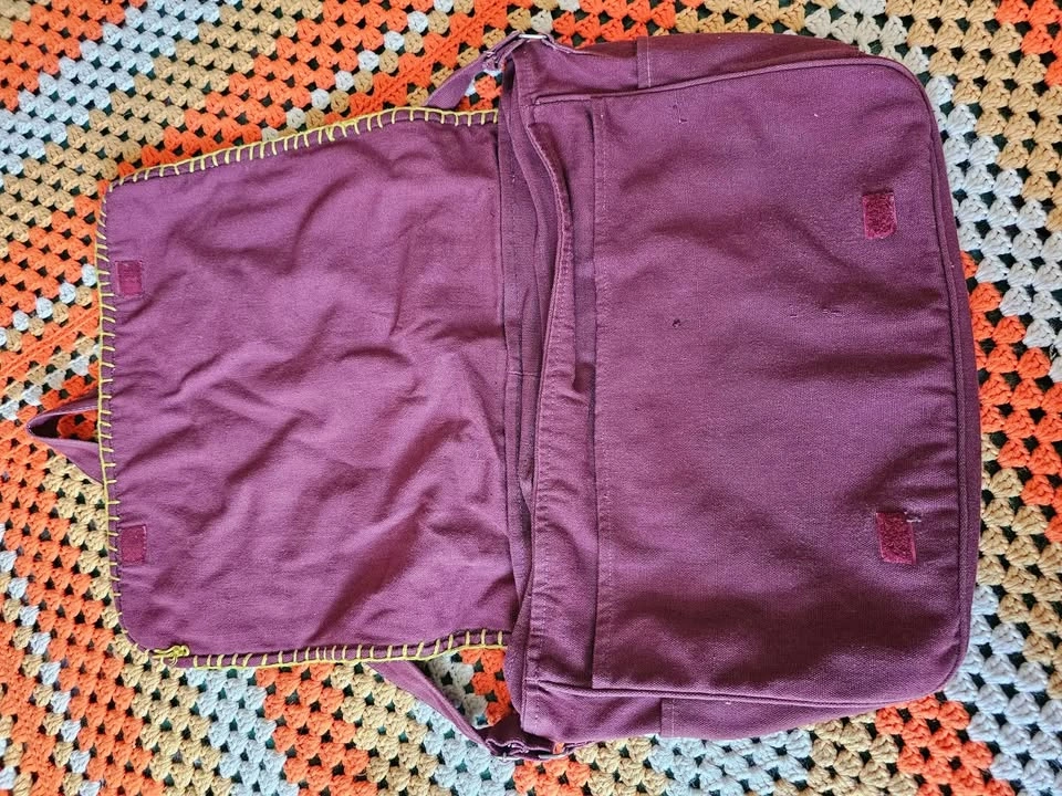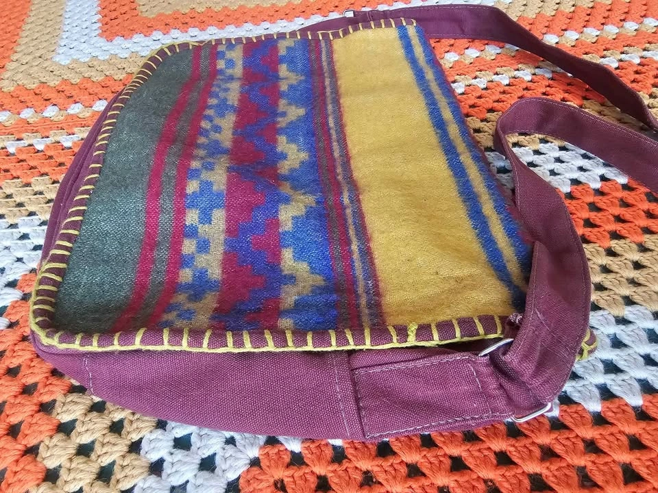 Made in India hippie/ bohemian style messenger bag, made of a thick plum purple/ burgundy/ brown woven cotton fabric. Bag has a woven front panel of a wool or wool-like fiber, with a bold pattern in muted earth tone shades of olive green, red, mustard yellow, and dark blue. Bag has one main compartment, one large front pocket, one inner zippered pocket, and small pockets on each side. The flap closes with velcro. Strap is adjustable and measures 41.5" when adjusted to its longest length. Bag measures about 17" long x 12" tall x 4" wide. Bag is in very good used condition. There are some minor flaws in the woven cotton that look like they have been there from the beginning, and a small area of discoloration at one inner corner inside of the main compartment.