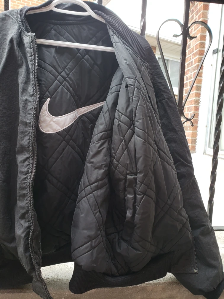 Selling a Nike bomber jacket in black. It features a quilted lining with a large Nike logo on the inside. Great for layering! can be warm in both sides