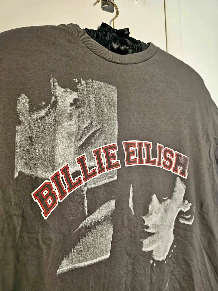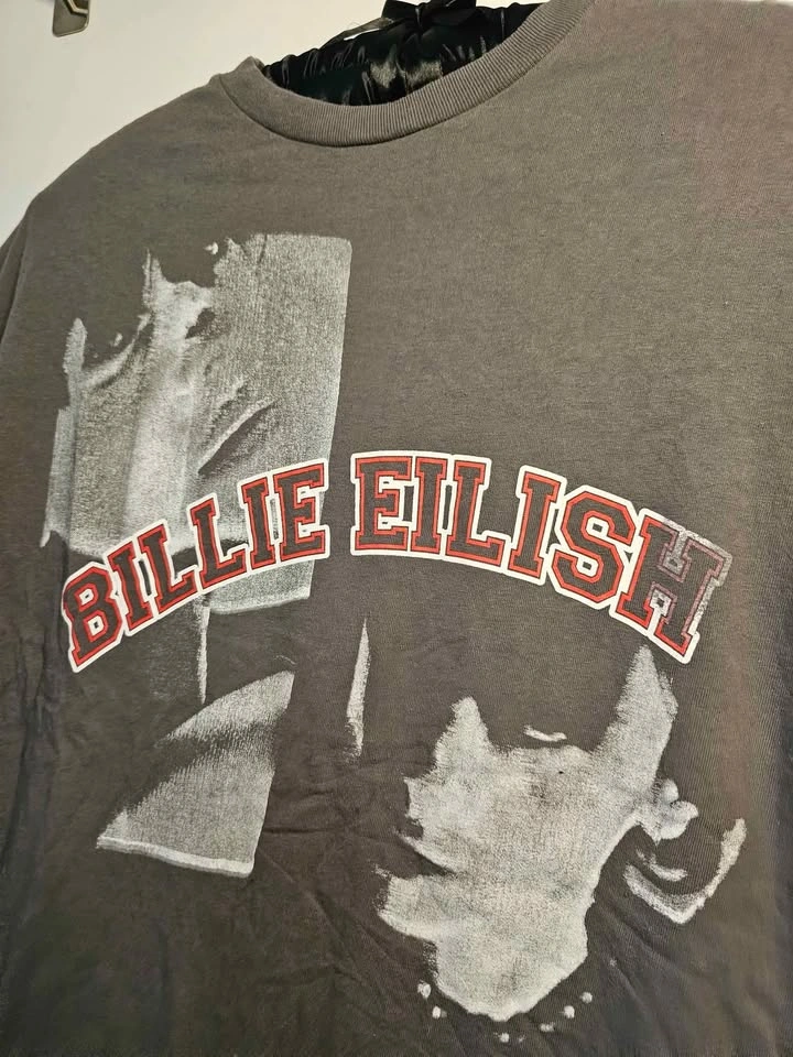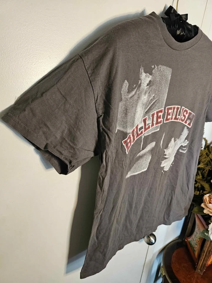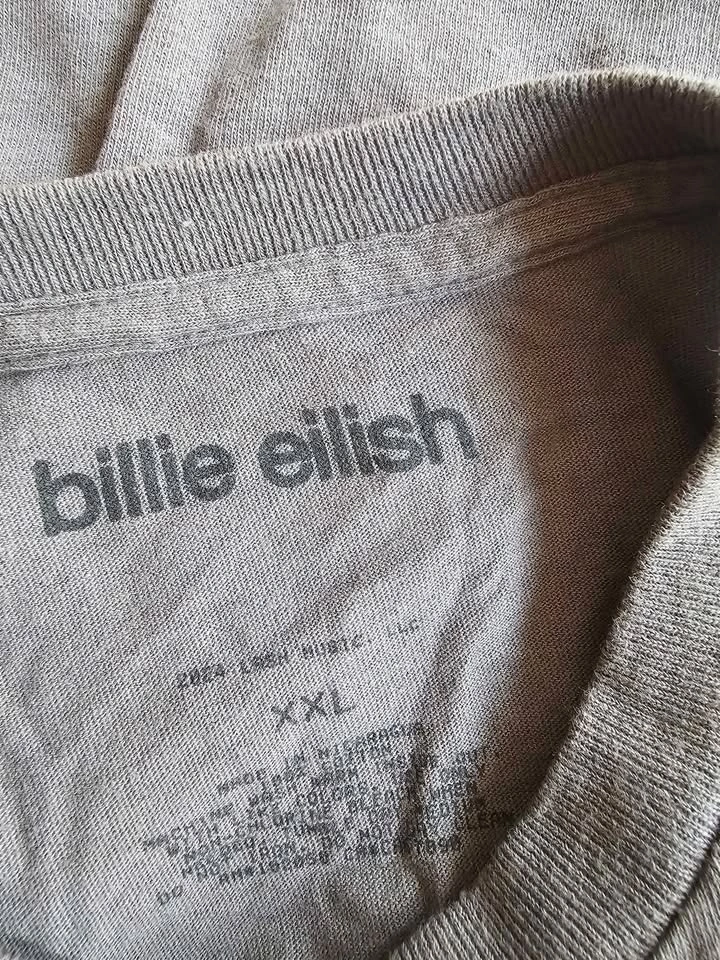 Official Billie Eilish light gray graphic t-shirt with varsity-style lettering, from 2024. Design is printed in a distressed/ pre-faded style in white and red. Shirt is a size XXL, perfect for those who wear an XXL anyways or for an oversized look on smaller folks that Billie would approve of. Shirt is in very good used condition with light signs of washing/ wear. No damage that I could find. Pit to pit measures about 23" and shoulder to bottom hem measures about 27.5".