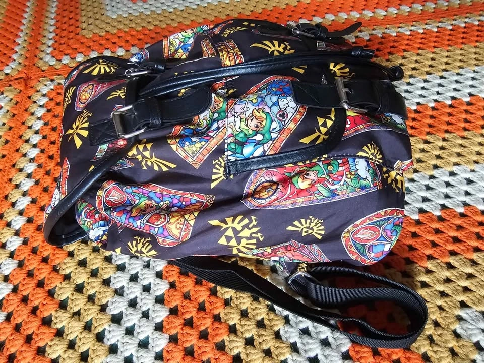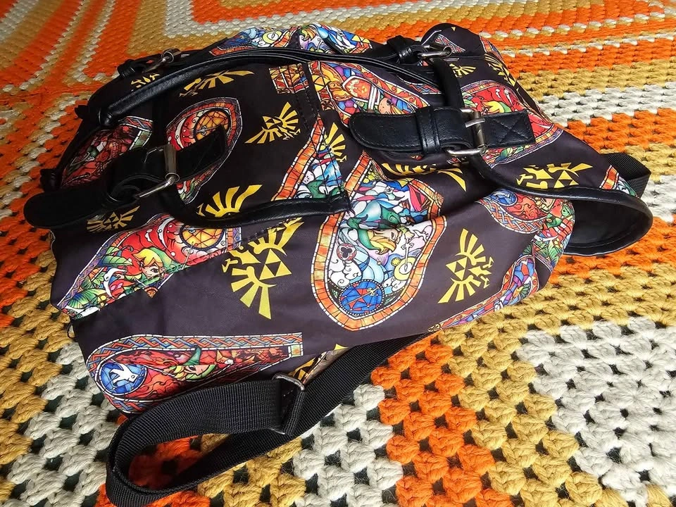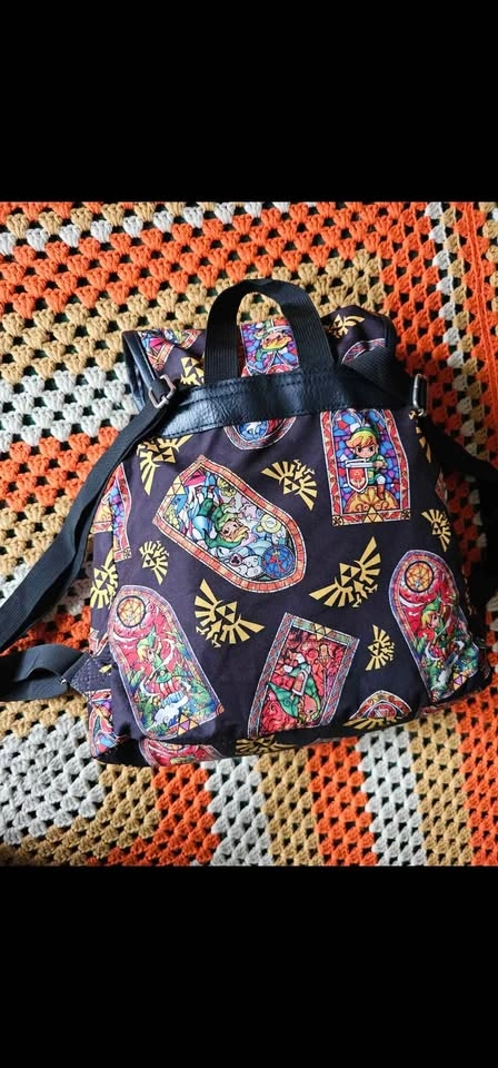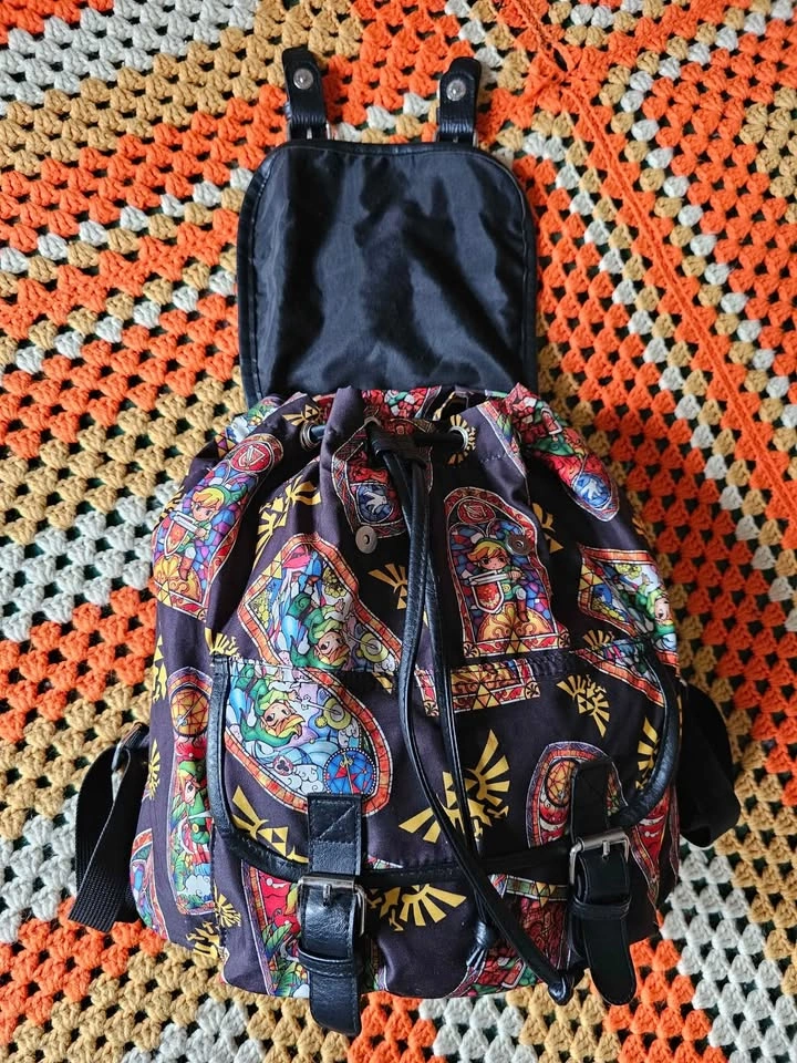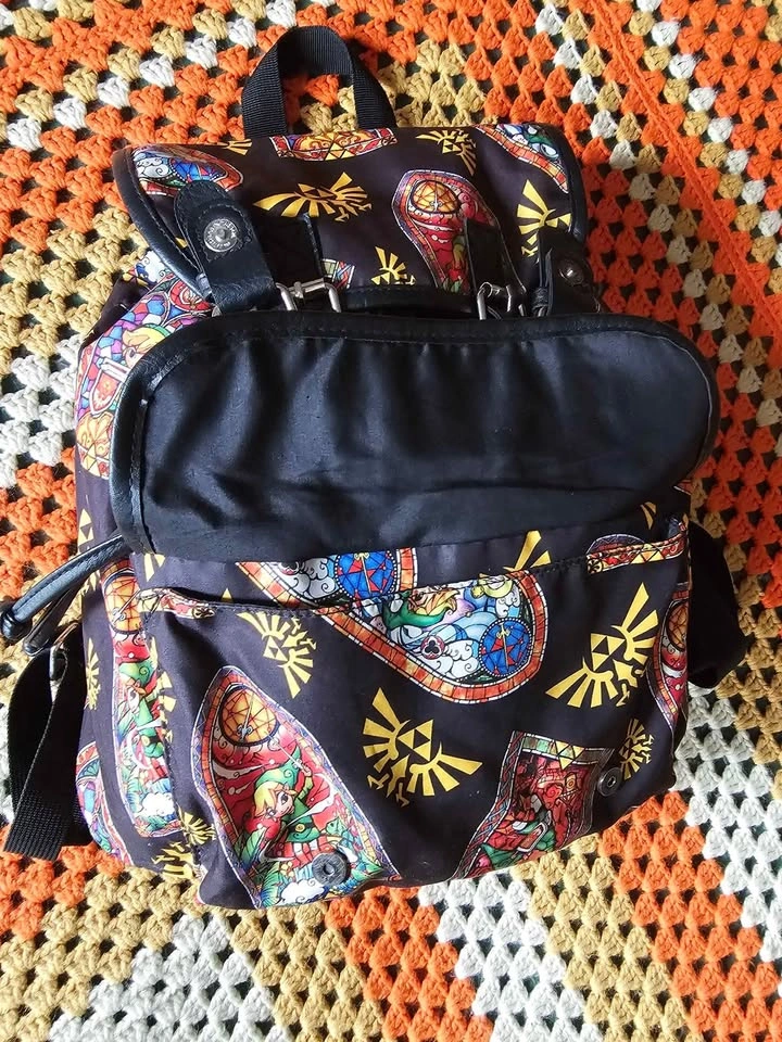 Official licensed limited edition Legend of Zelda merch! Black slouchy backpack with a charming design featuring stained glass panels with Link in various poses, and yellow logos. Backpack is trimmed in black faux leather. It has one front pocket and a main compartment, both close with flaps and magnetic snaps on large faux leather buckles. Main compartment also has a faux leather drawstring and one inner zippered pocket. Straps are nylon and adjustable, and it has a nylon carry strap on the top. Made by Nintendo in 2015. Backpack is in good used condition. The external fabric and lining are both in great shape, with a small stain on the bottom panel that is not noticeable - see last photo for detail. There is one grommet that has popped out on the drawstring closure. Backpack measures approximately 11" tall x 13" wide x 5.5" deep.