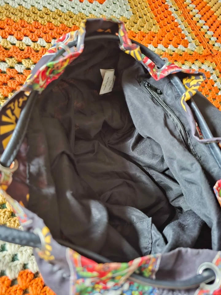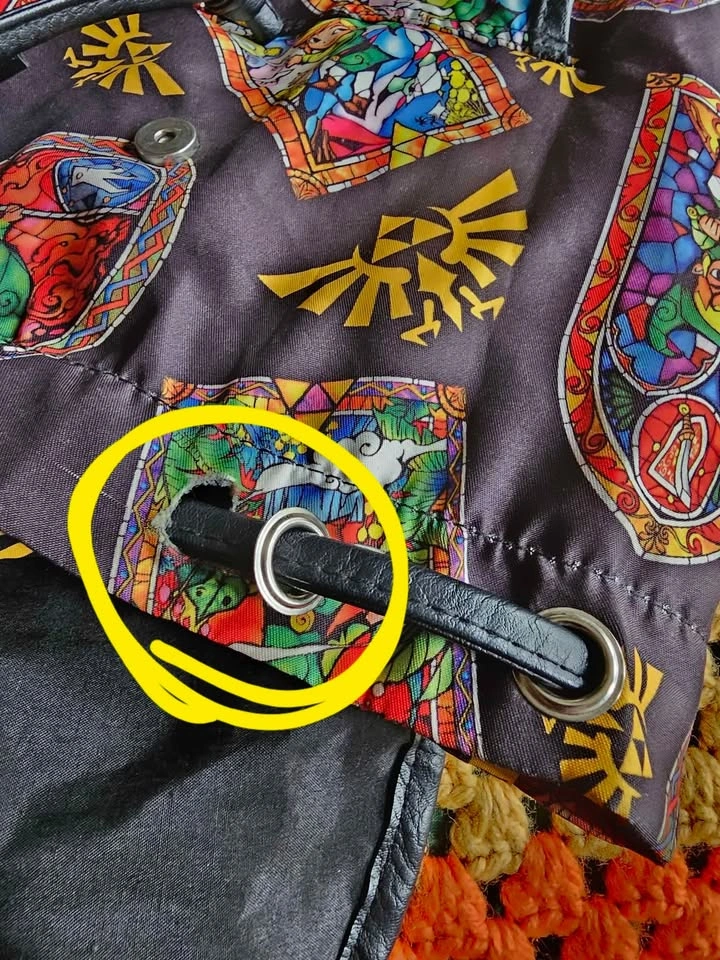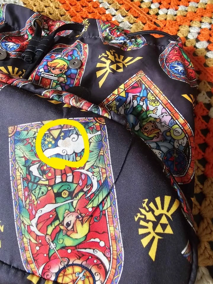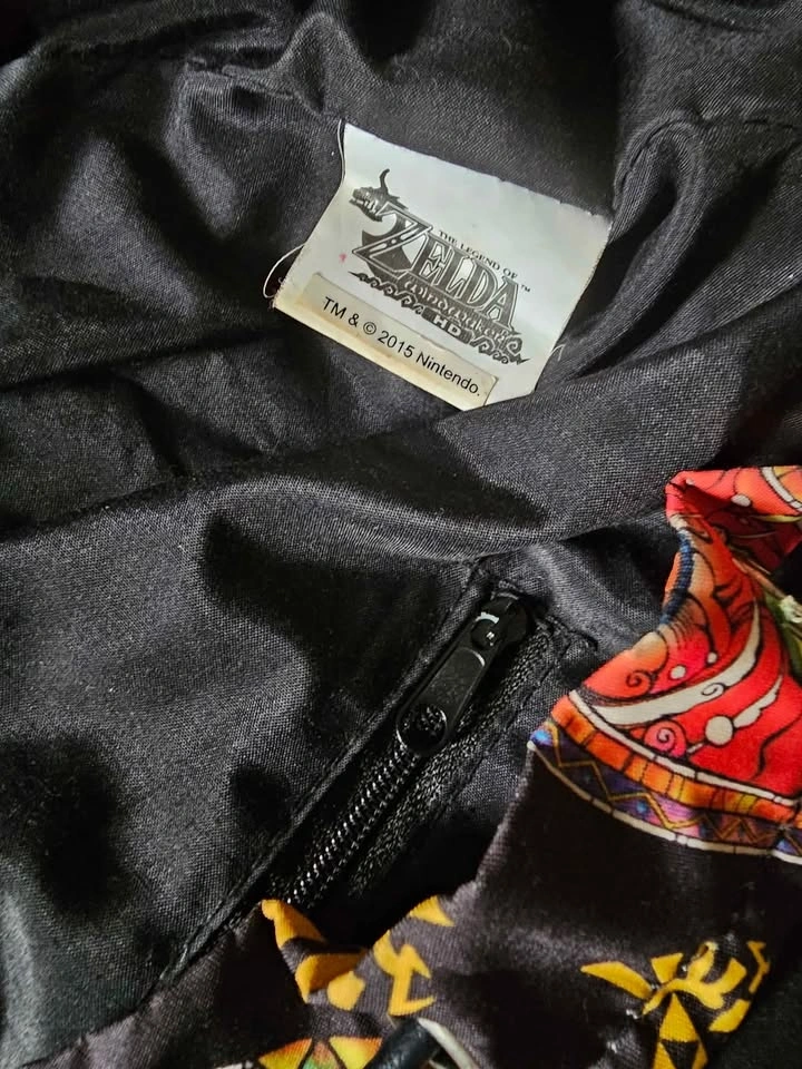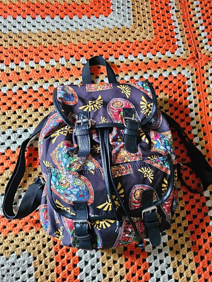 Official licensed limited edition Legend of Zelda merch! Black slouchy backpack with a charming design featuring stained glass panels with Link in various poses, and yellow logos. Backpack is trimmed in black faux leather. It has one front pocket and a main compartment, both close with flaps and magnetic snaps on large faux leather buckles. Main compartment also has a faux leather drawstring and one inner zippered pocket. Straps are nylon and adjustable, and it has a nylon carry strap on the top. Made by Nintendo in 2015. Backpack is in good used condition. The external fabric and lining are both in great shape, with a small stain on the bottom panel that is not noticeable - see last photo for detail. There is one grommet that has popped out on the drawstring closure. Backpack measures approximately 11" tall x 13" wide x 5.5" deep.