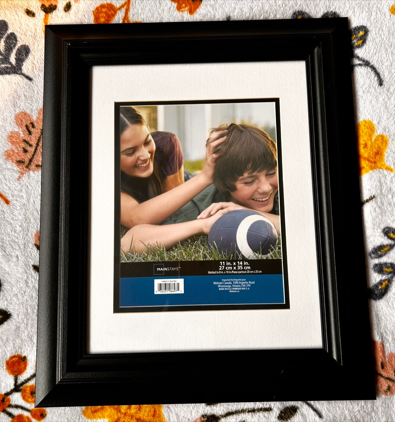 Selling a Mainstays picture frame, perfect for displaying your favourite memories! It's in great condition. - Size: 11 in x 14 in (27 cm x 35 cm) - Colour: Black If the ad is up it’s available.