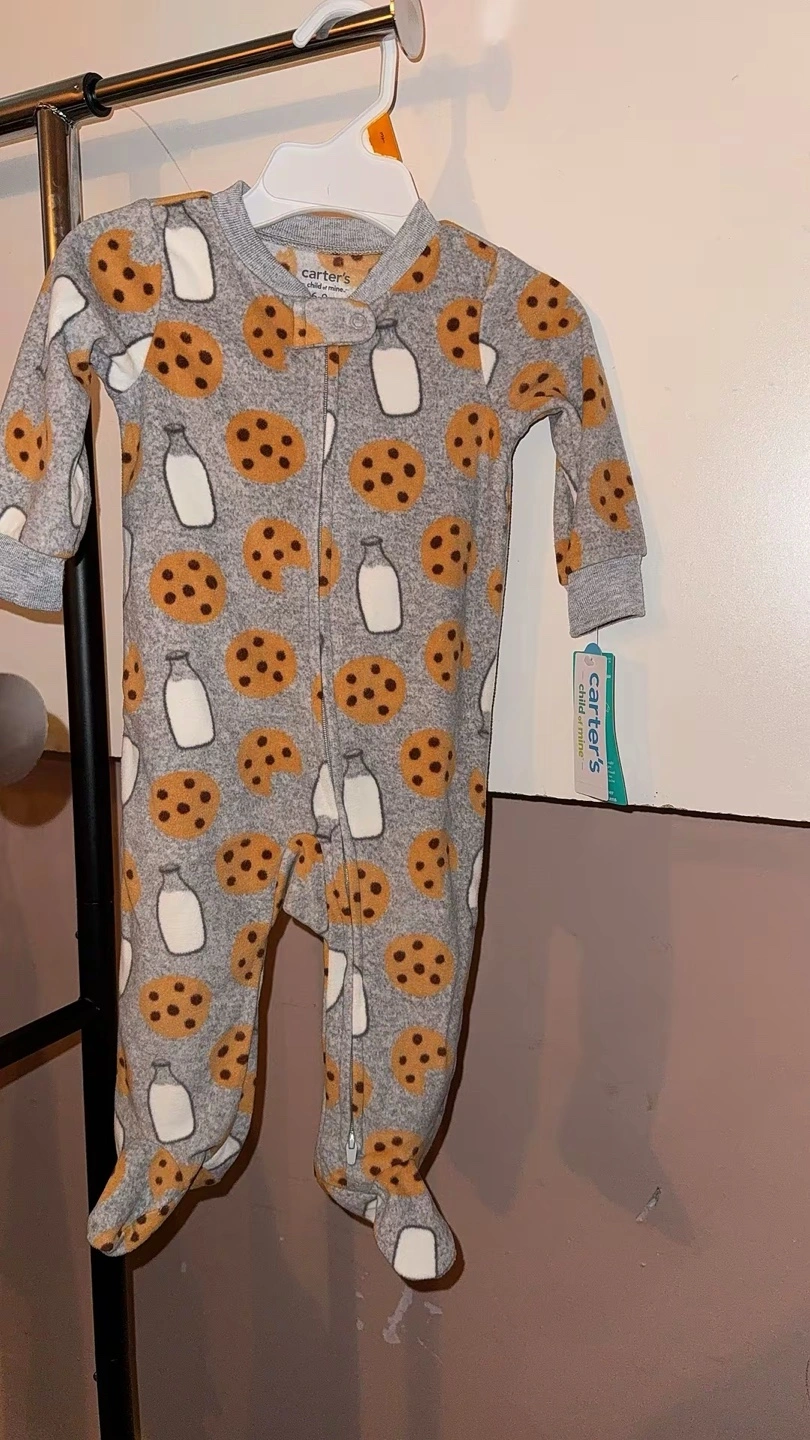 Super cute Carter's footed pajamas in size 6-9 months! The grey fleece is covered in a sweet cookie and milk pattern. Perfect for keeping your little one cozy and comfy