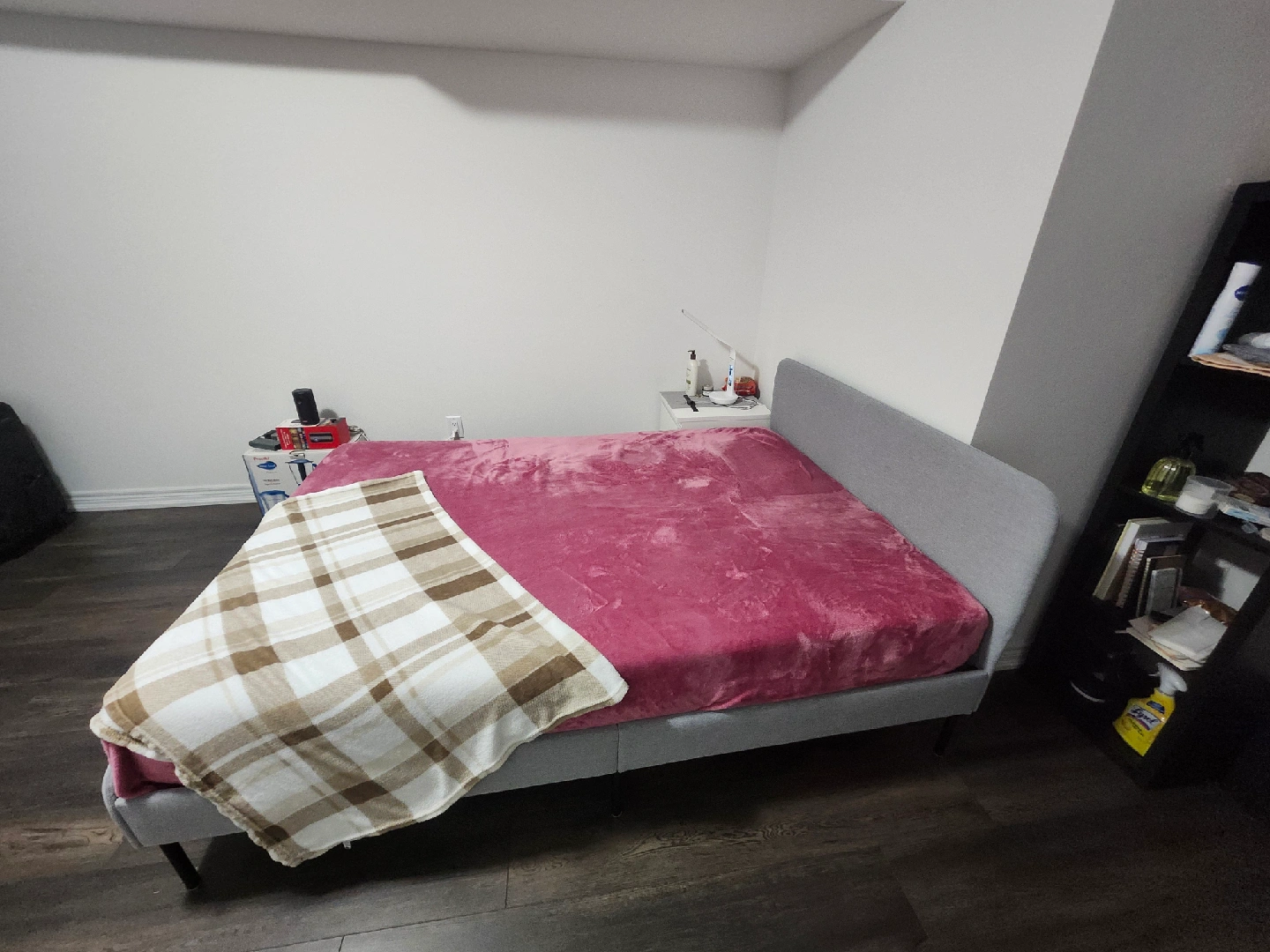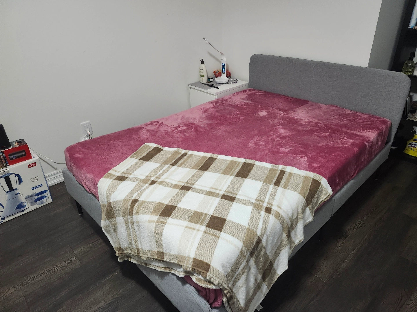 Selling a queen size bed frame with a mattress. It's in good condition and ready for a new home. The bed frame is a neutral grey in colour and the matress is a foam matress. Perfect for a guest room or a first apartment