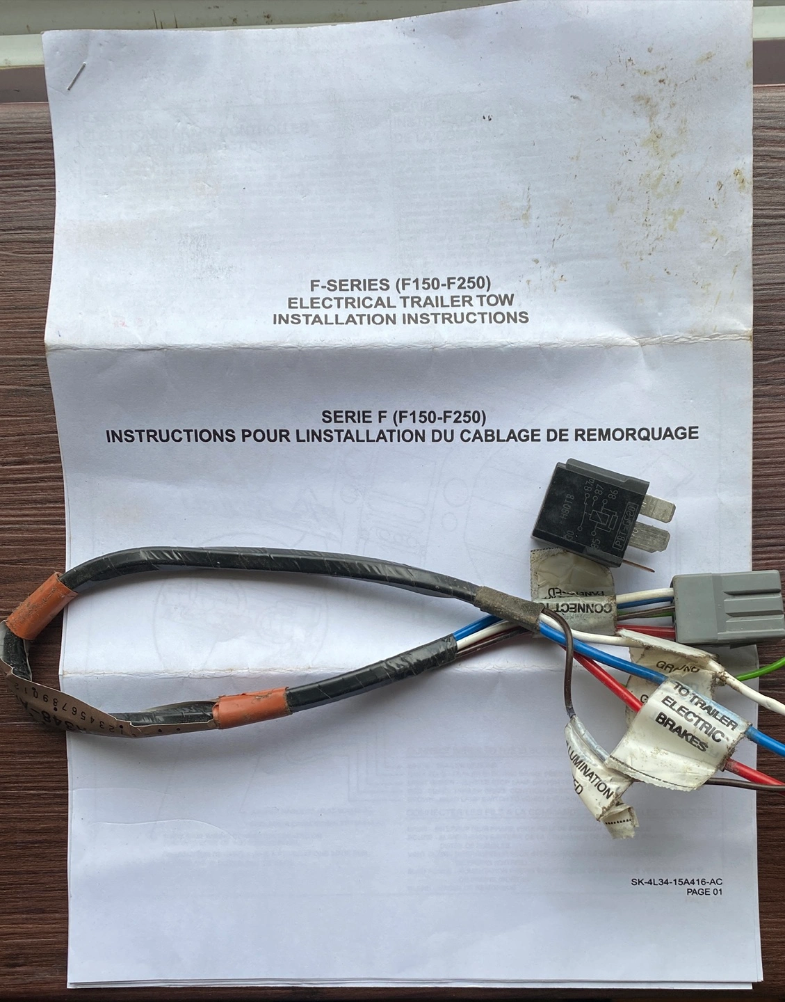 This kit is designed for installing trailer towing electrical components on Ford F-Series trucks, specifically F-150 and F-250 models. It includes the necessary wiring harness and installation instructions for connecting trailer lights and potentially electric brakes. The part number visible on the instructions is SK-4L34-15A416-AC, which can be used to find compatible parts or replacements.