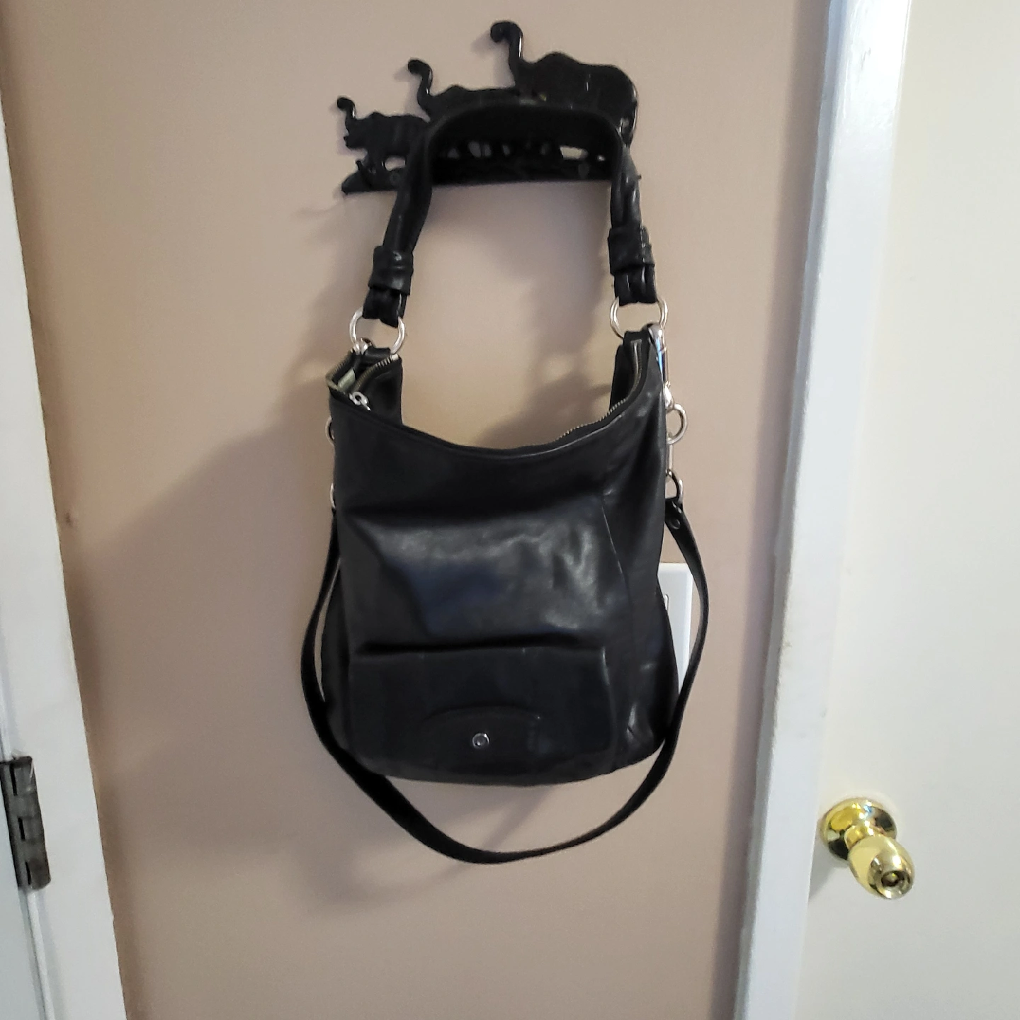 Selling a Coach black leather handbag. It's in New condition and has a light blue interior. The bag has silver hardware and a zipper closure. Perfect for everyday use! Smoke free home Rossland and Stevenson north