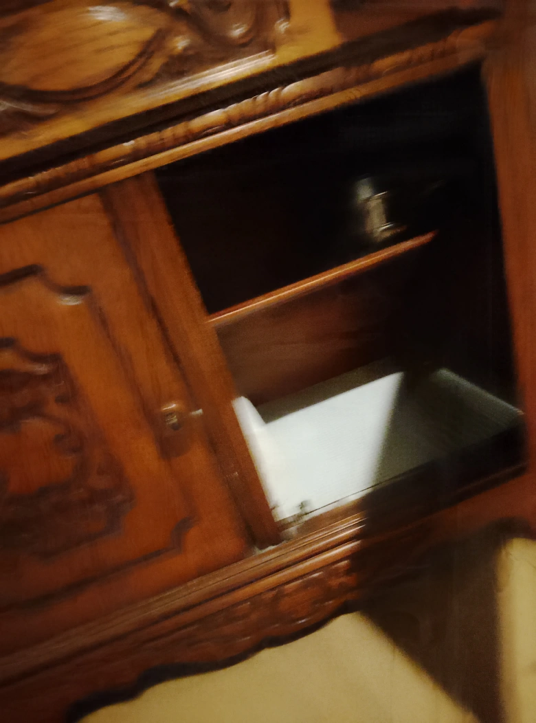 Selling a vintage wooden china cabinet. It has a glass display cabinet on top and a cabinet with doors on the bottom. The wood has a beautiful, warm tone and intricate artisanal carvings. It shows few signs of wear and small scratches, but it is otherwise in great condition and very sturdy.