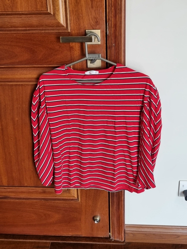 Mango Casual top with a striped design! It features a vibrant red colour with white stripes. The sleeves are like puff sleeves. Perfect for a casual, everyday look!