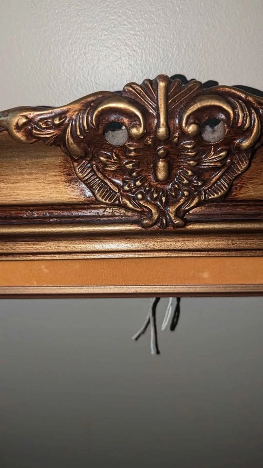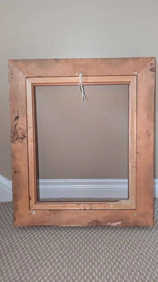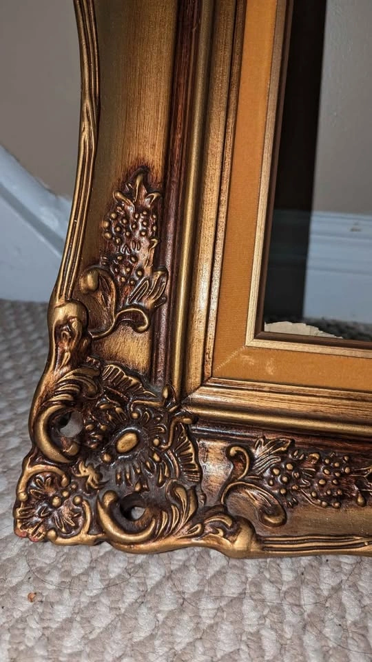 Beautiful vintage wooden frame with ornate floral/scroll detailing and gold finish. Perfect for artwork, photography, mirrors, or as a statement décor piece. Opening size: 16x20 inches Outer size: approx. 21x25 inches Solid wood construction with decorative molding - Vintage patina adds character Really great condition especially considering the age, no cracks or chips! No holds without payment - pick-up in Burlington