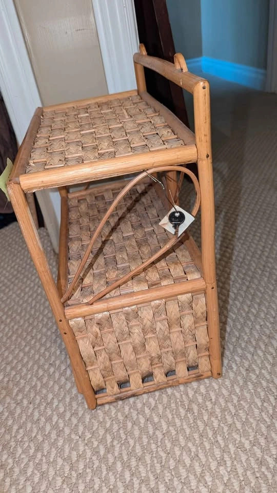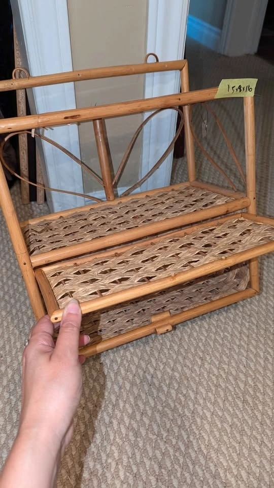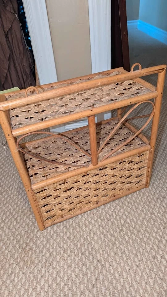 Vintage bamboo + woven wicker wall shelf for holding plants, books, keys, or small décor. Can be hung on the wall, also features a handy drop-down front basket for extra hidden storage. Dimensions: 15” W x 8” D x 16” H Condition: Excellent vintage condition, sturdy frame, natural wear consistent with age. Mid-century boho / coastal / cottagecore / rattan for entryway, bathroom, kitchen, or as part of a bohemian gallery wall. Burlington - no holds