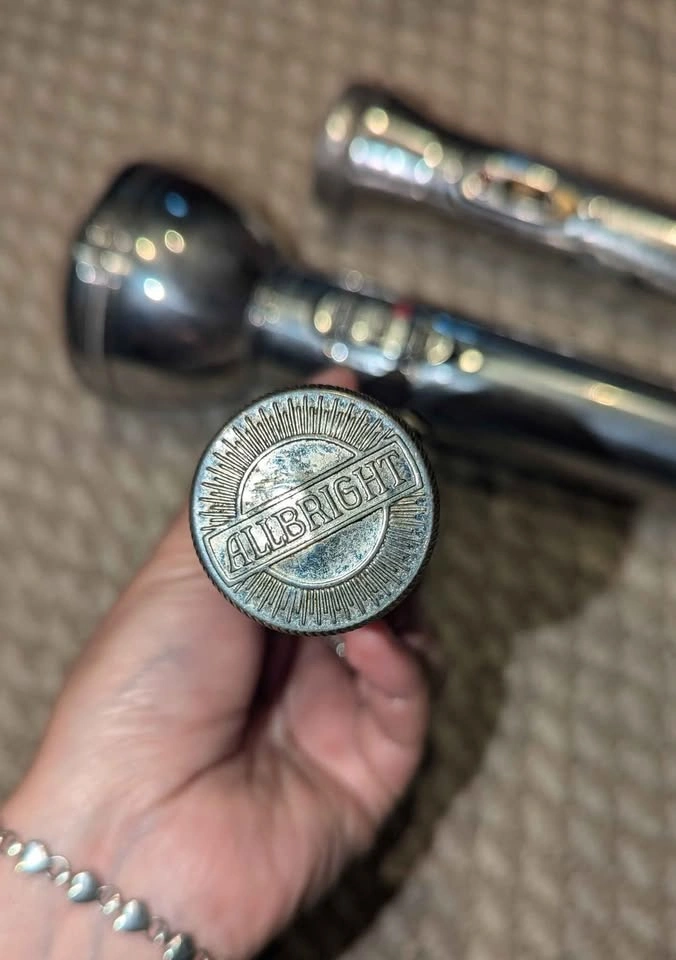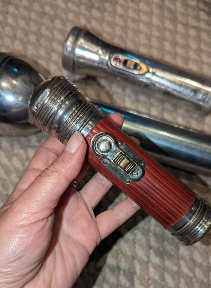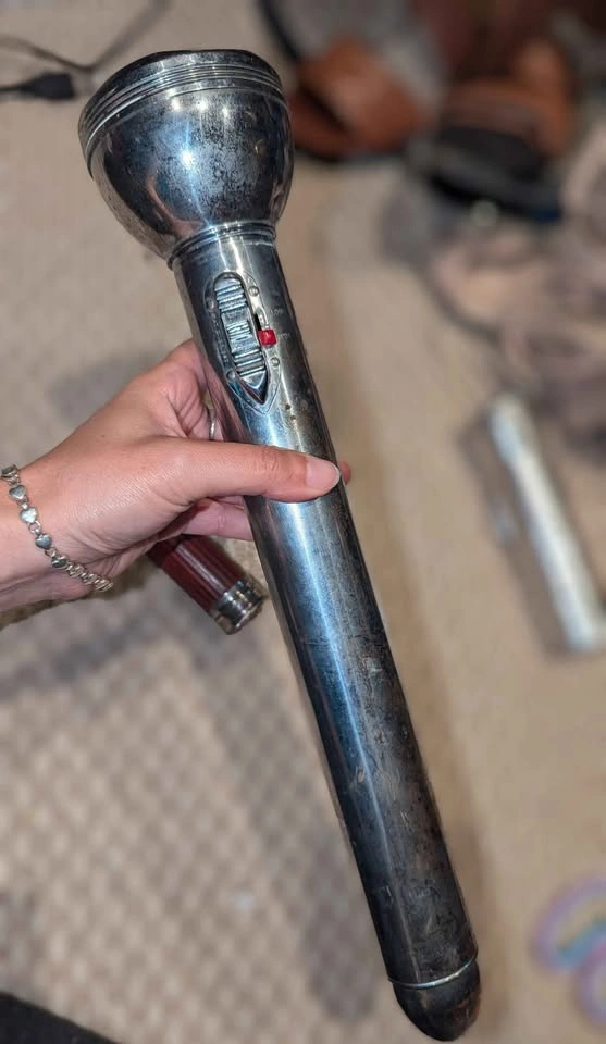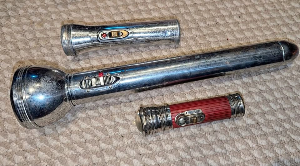 Selling a unique set of 3 vintage flashlights, great for collectors, display, restoration, or prop use. These classic metal torches have a lot of character with their aged patina. Selling as a lot for $30 otherwise priced individually as below: ($20 individually) 1. Large Chrome Flashlight – stamped PAT. 2173831 on the flood/spot slider (U.S. patent from the 1930s–40s). Adjustable beam (Flood/Spot), heavy-duty metal body, approx. 15" long. ($10 individually) 2. Medium Chrome Flashlight – marked V.K. Song & Co. Ltd. Hong Kong on the end cap. Approx. 8" long. ($15 individually) 3. Small Red & Chrome Flashlight – marked ALLBRIGHT on end cap, ribbed body design, approx. 6.5" long. All show age, wear, and patina from years of storage. Untested – selling as-is. Does not come with batteries. Perfect for vintage collectors, industrial décor, or photography/film props.