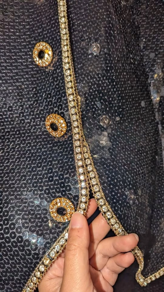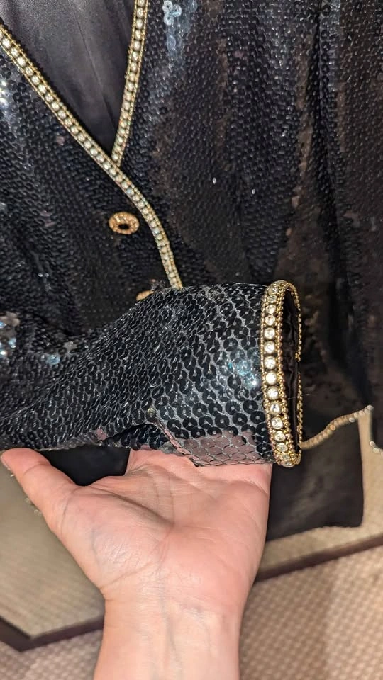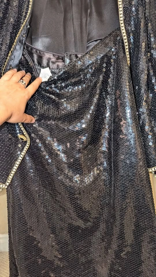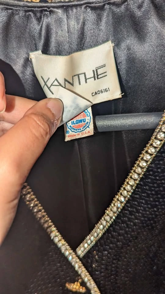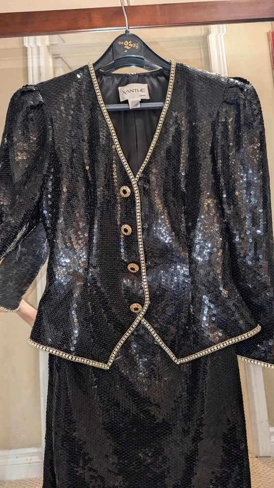 Stunning and rare vintage evening set from Xanthe. Made in the USA with union craftsmanship (ILGWU label), this piece is retro glam 80s/early 90s. Perfect for collectors, vintage lovers, or anyone who wants to stand out at a formal event, party, or stage performance. Two-piece set: jacket + matching long skirt Black sequin fabric throughout with rhinestone trim in perfect condition. Statement rhinestone buttons with gold-tone accents Fully lined, tailored fit with structured shoulders. Fits short - petite (small/size 6 approx) specific measurements available by request for serious inquiries. Pickup Burlington - please check out my other listings!