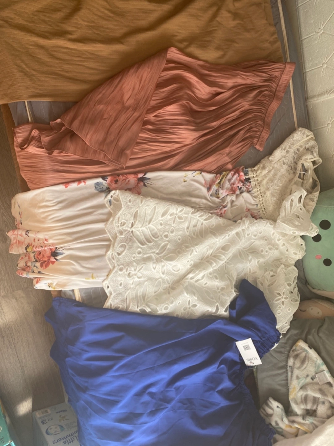Selling a lot of assorted women's clothing. Includes a black and white patterned dress and cardigan set, a pleated midi skirt, a floral dress, and a blue off-the-shoulder top. All in good condition and ready for a new home!