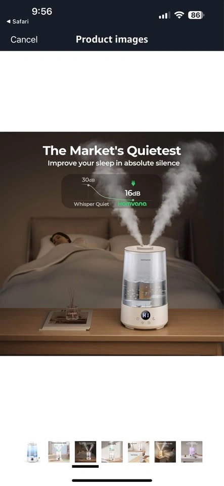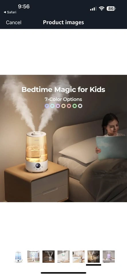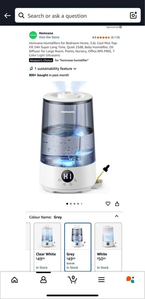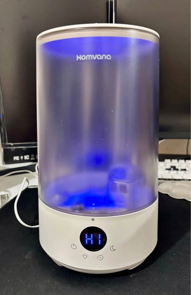 Condition: New-Open Box Retail Price: $50 Homvana Humidifiers (grey) for Bedroom Home, 3.6L Cool Mist Top-Fill 34H Super Long Time, Quiet 23dB, Baby Humidifier, Oil Diffuser for Large Room, Plants, Nursery, Office BPA FREE, 7 Color Light Ultrasonic Brand - Homvana Special feature - Cool Mist Humidifiers Colour - Grey Filter type - Filter Free Capacity - 3.6 liters Floor area - 16 dB Product Dimensions 19.5D x 20.7W x 28.5H Centimetres
