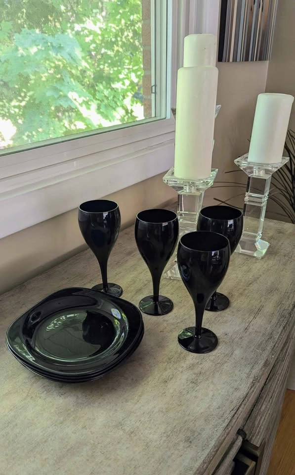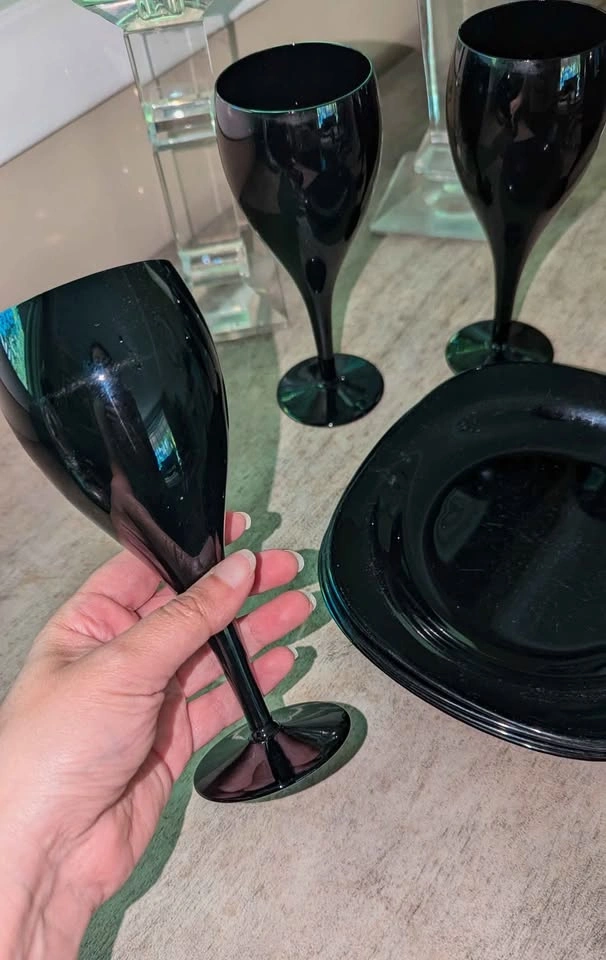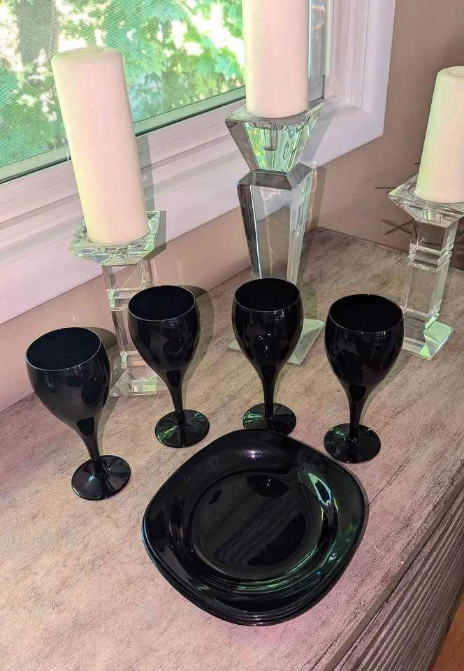 Gothic dinner parties! Ready for spooky season. Rare & Vintage set! Amazing black amethyst GLASS Goblets (x4) and side plates (x4) Very good condition, no cracks or chips , a bit of wear visible on the plates surface under bright lighting A must have for Halloween! 40 for the set, includes 4 glasses, 4 side plates. Not sold individually.
