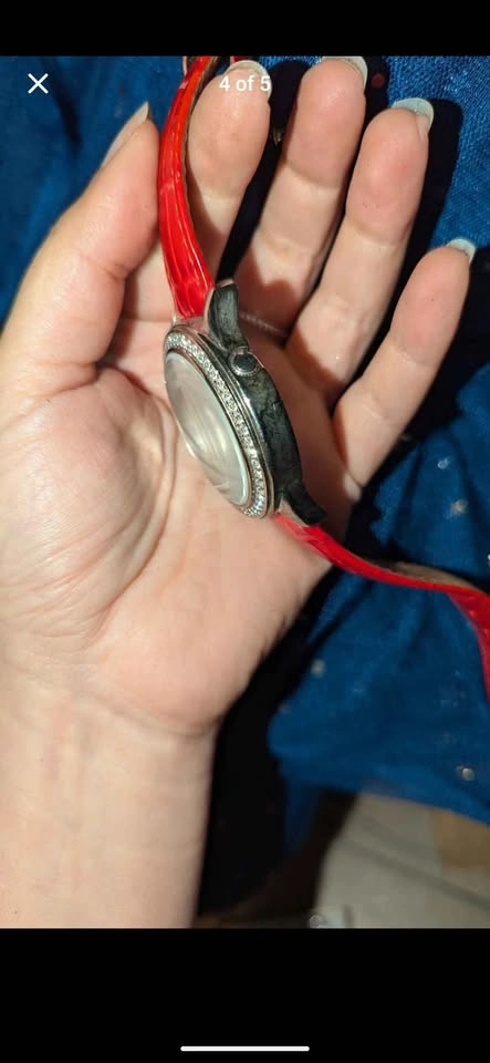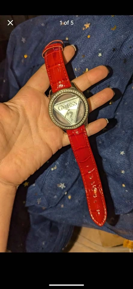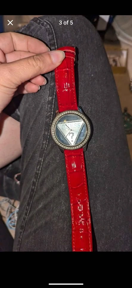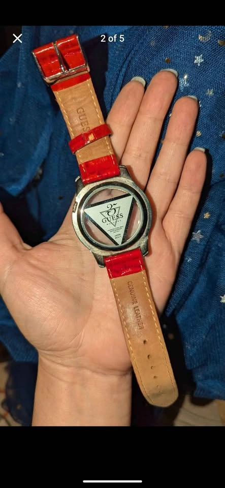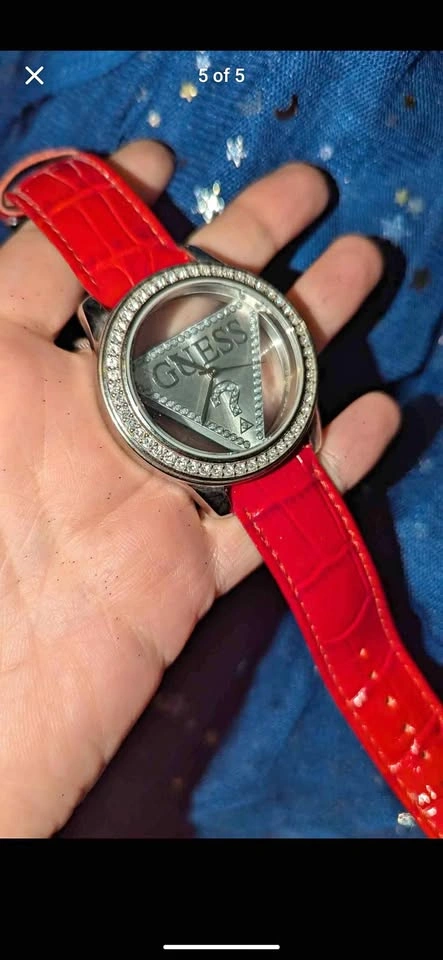 Bright & bold ladies wrist watch, red leather band with stainless steel backing, gemstone inlay water resistant. In very good condition, needs new battery, sold untested. Made in Japan from GUESS?