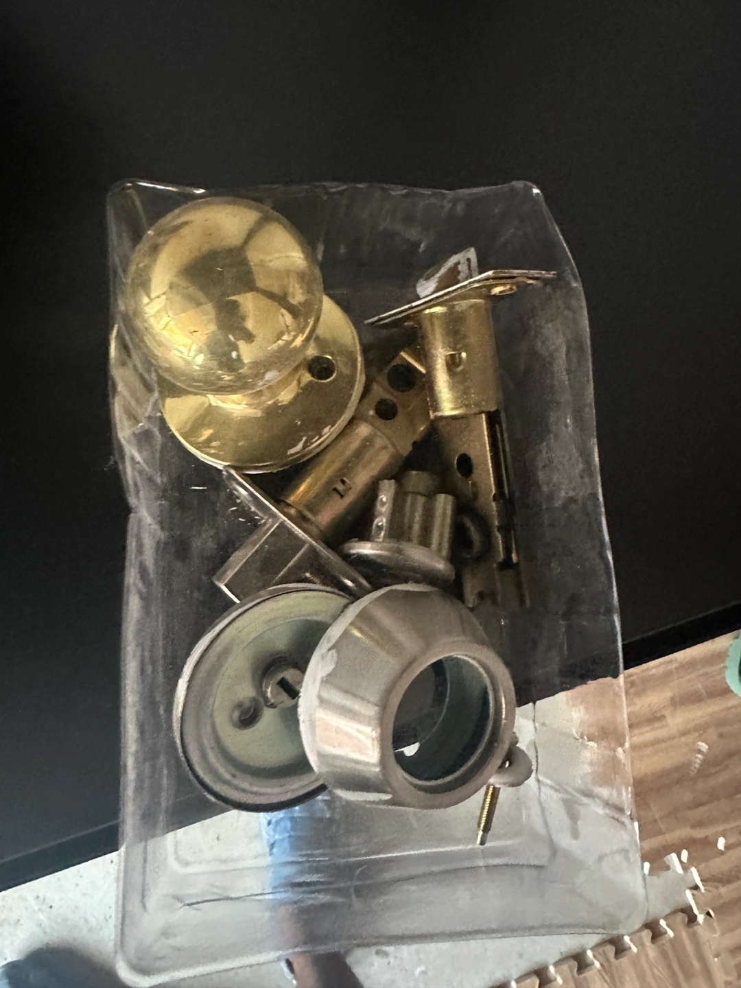Selling a complete door knob set, perfect for replacing or installing a new door knob. Includes all necessary components for installation. The set is a mix of brass and silver finishes.