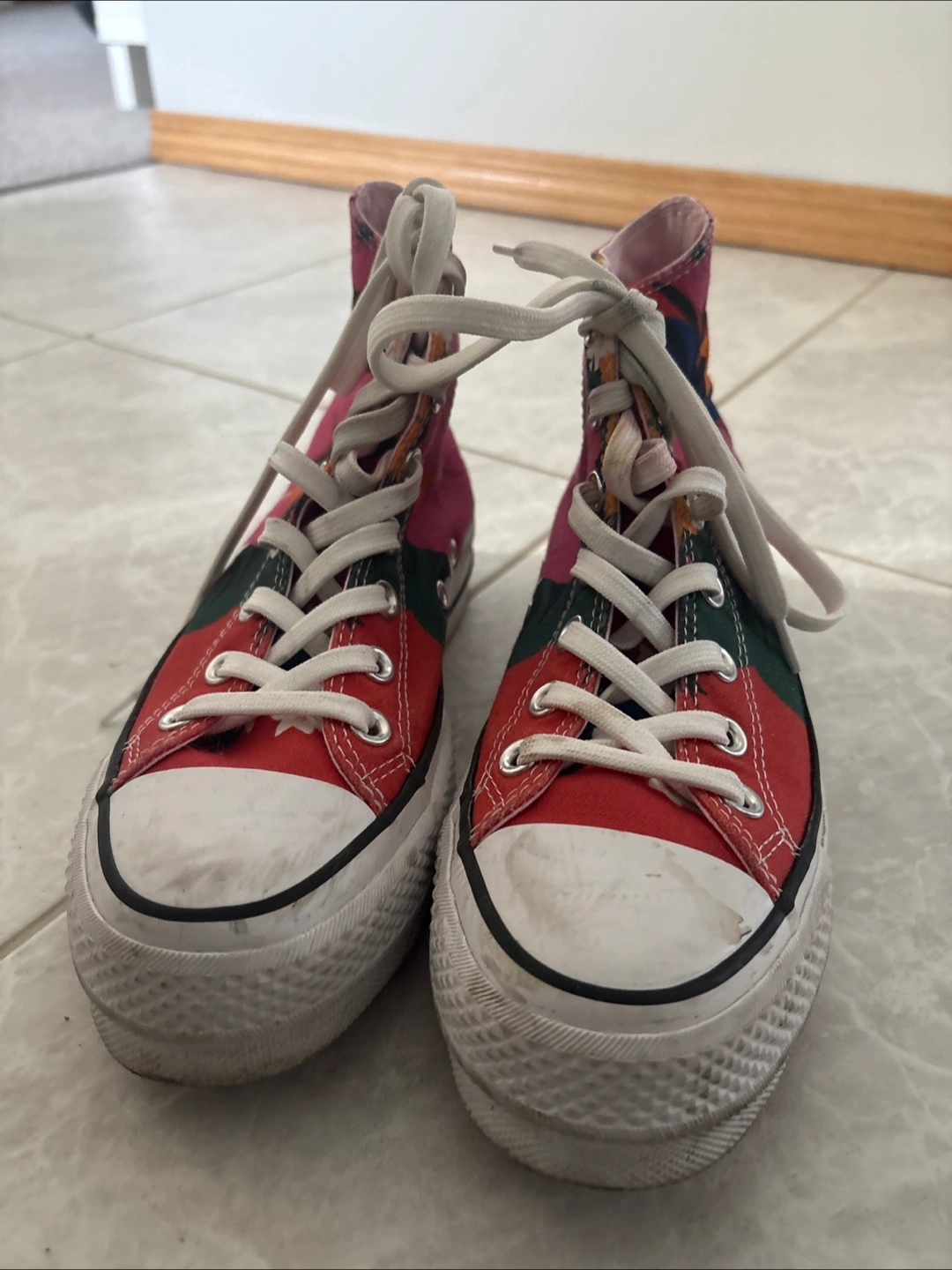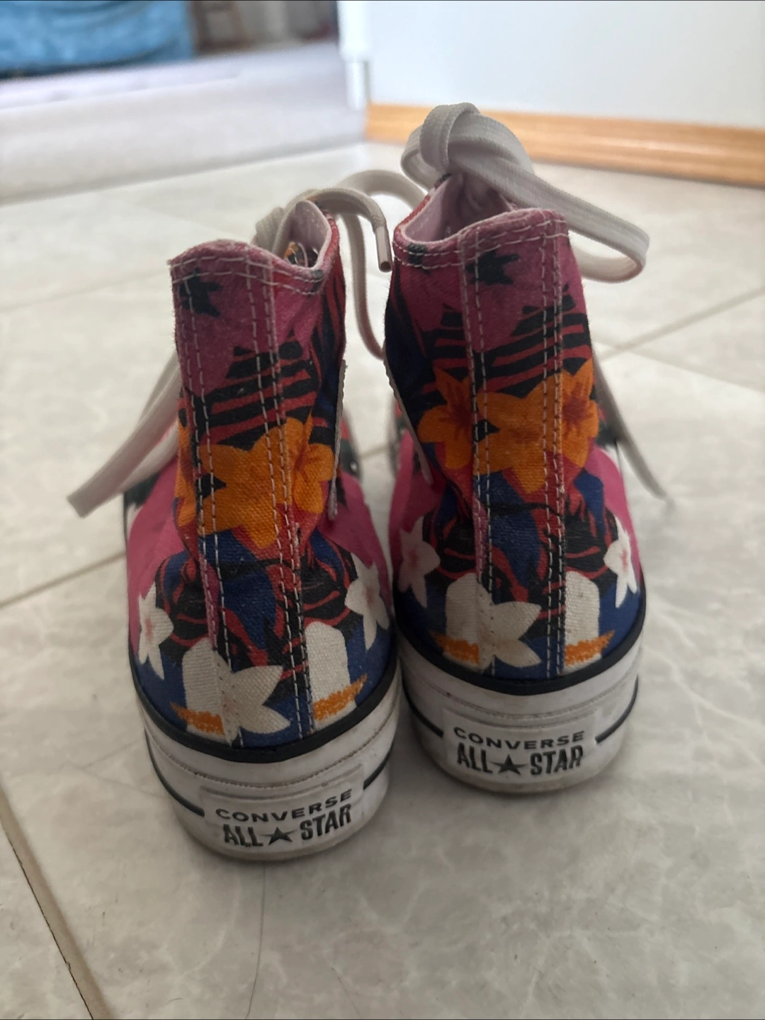 Selling a pair of Converse All Star high top sneakers. They have a fun floral and striped design. The shoes are in good condition with some signs of wear, as shown in the photos. They would be great for adding a pop of colour to your outfit!