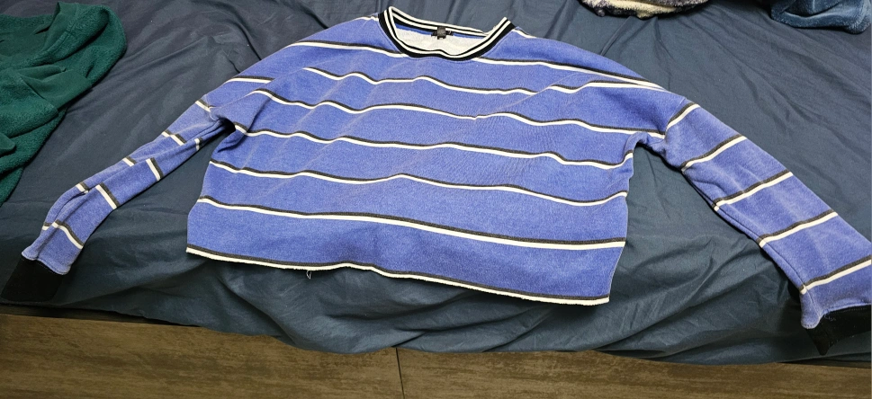 Selling a cute striped cropped sweater in blue! It has a black and white striped collar and black cuffs. Great for layering or wearing on its own