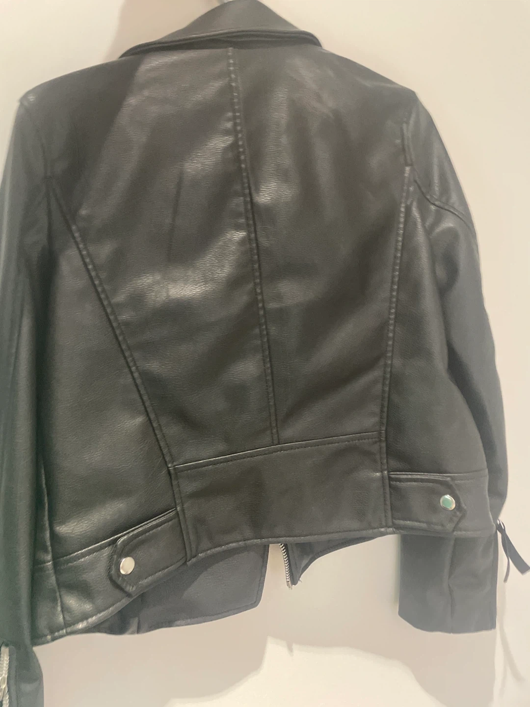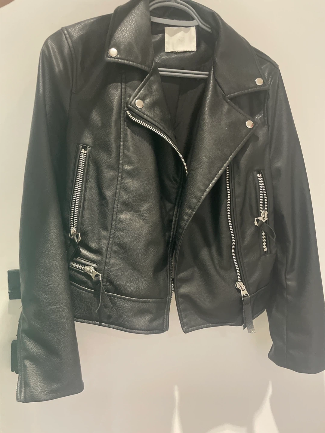 Selling a stylish black faux leather jacket! It's in great condition and perfect for adding a bit of edge to any outfit. The jacket features a classic biker design with multiple zippers and a comfortable fit. It's made of a durable faux leather material.