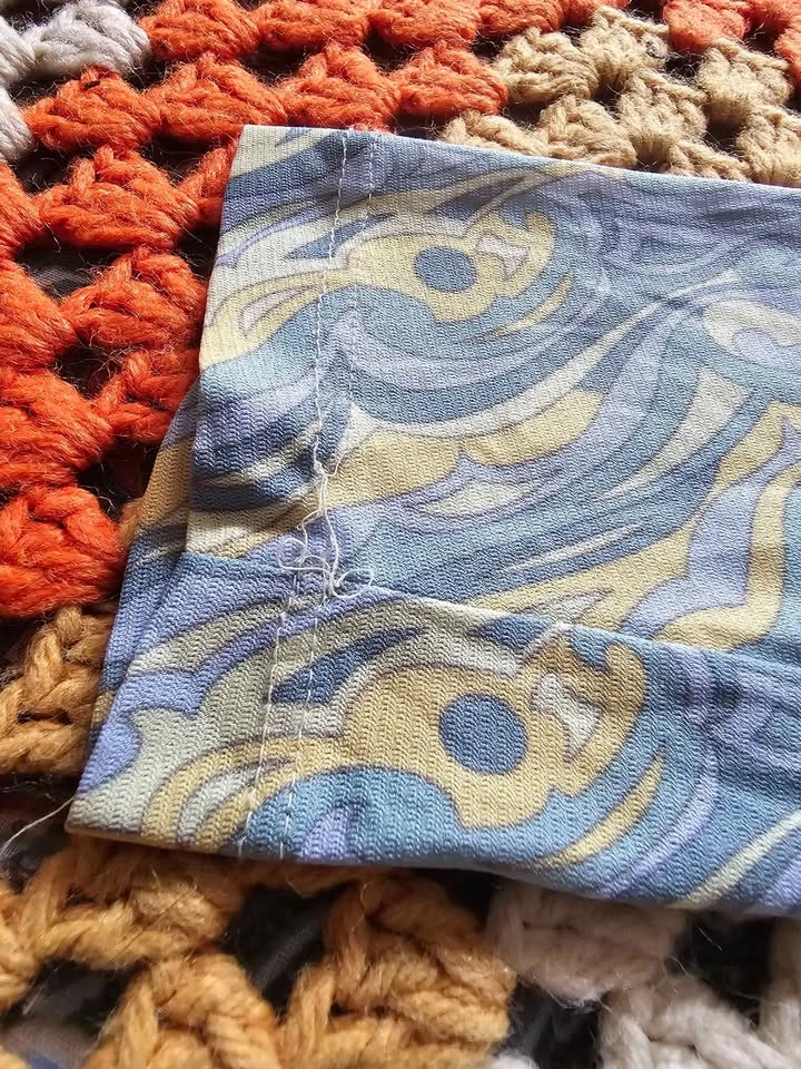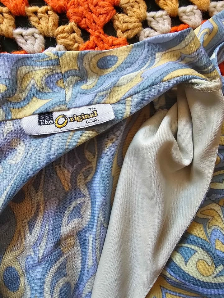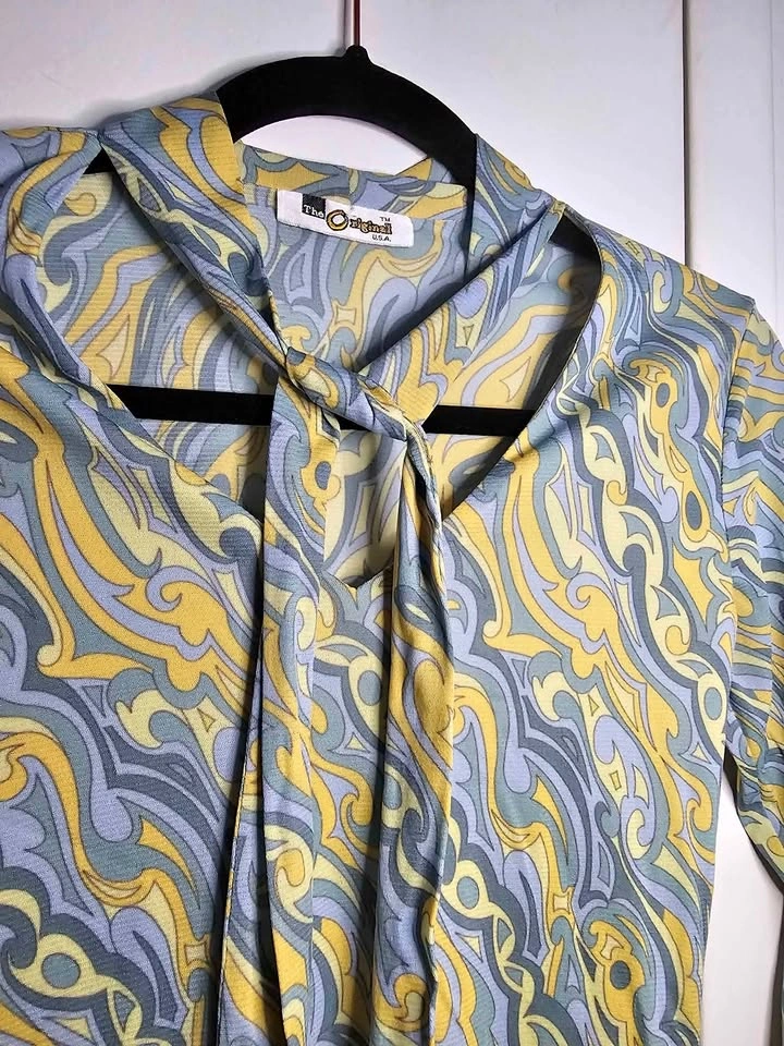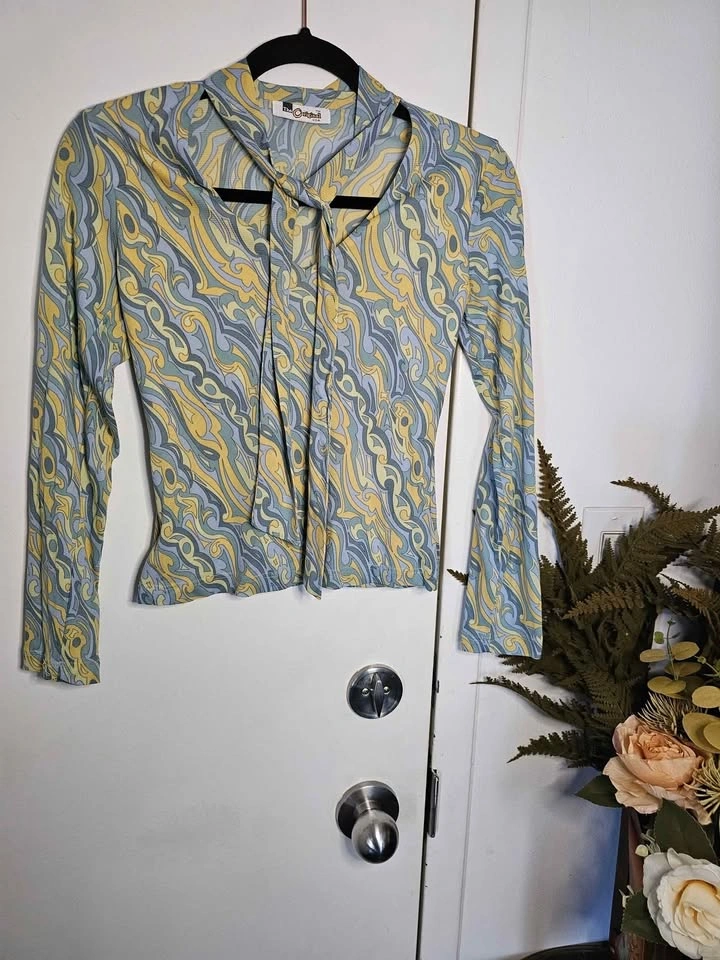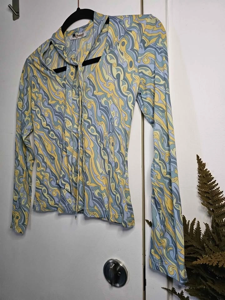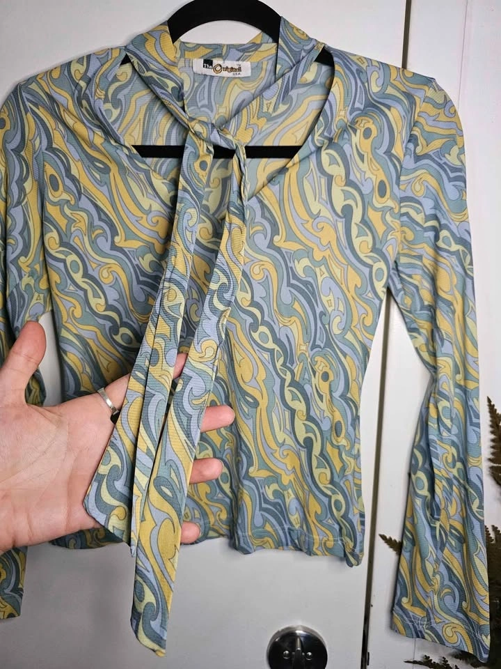 Super cute vintage long sleeve crop top in pale yellow and blue tones, with a fun psychedelic-inspired pattern. The top is mesh, but it's a thicker mesh than the cheap imitations of this style that are sold nowadays. It is lined in the front of the torso and semi-sheer in the sleeves and the back. The top has a v-neck with an attached neck sash. It's giving a 90s re-imagining of retro 70s vibes! The top is made by The Original and doesn't have a size tag. It fits like a Small based on measurements. Pit to pit measures about 16" unstretched and has lots of stretch to it. Pit to sleeve hem measures about 18". The top is in very good vintage condition, there is one section of loose stitching at a sleeve hem and no other flaws that I could find.