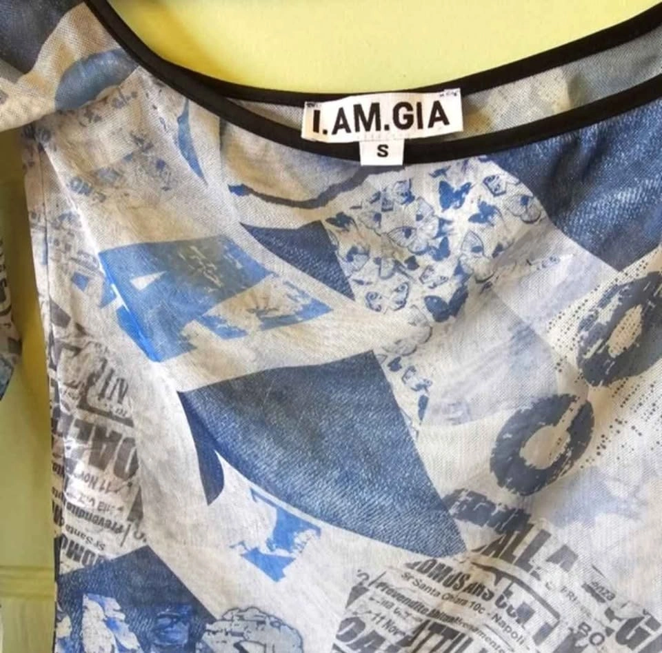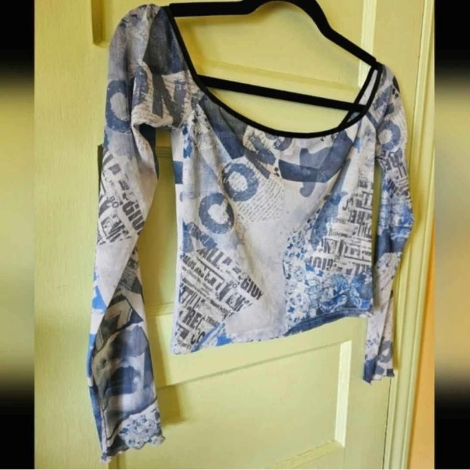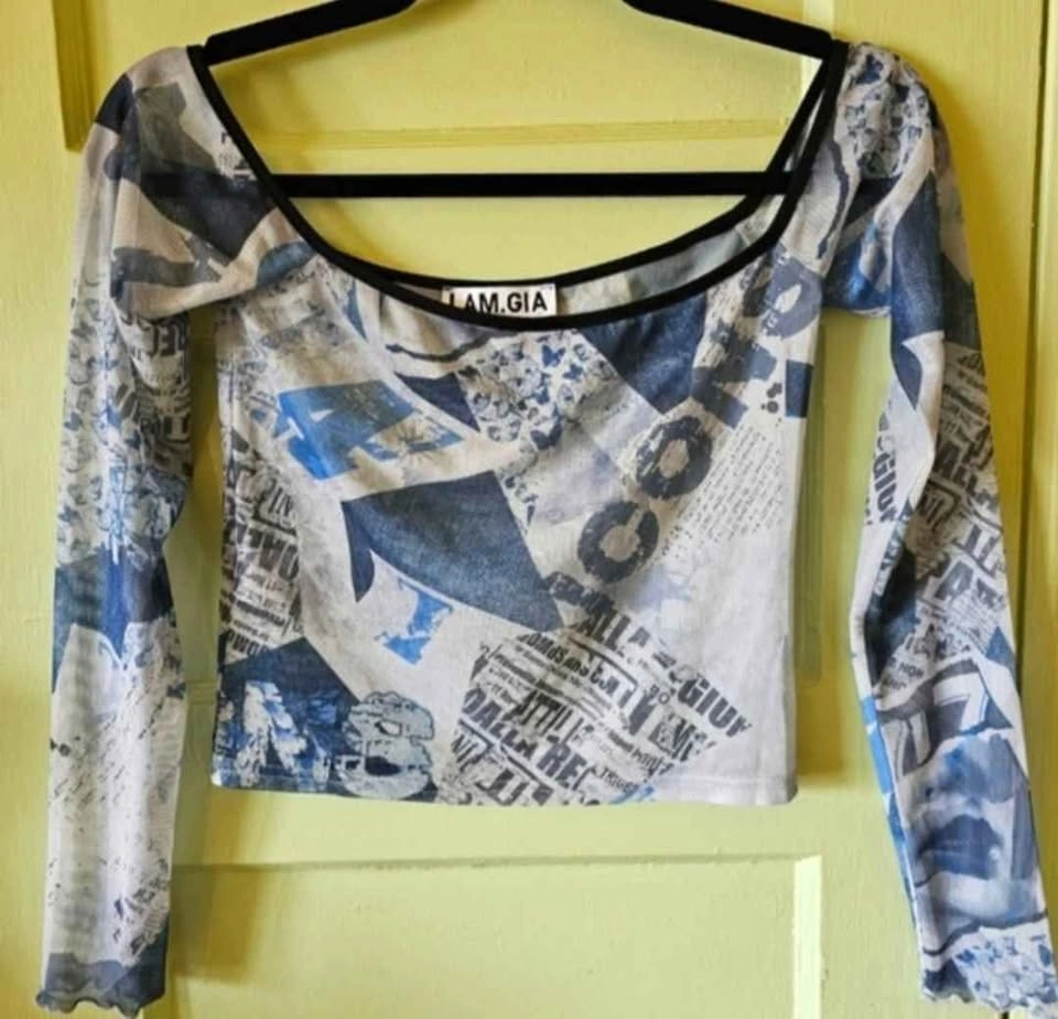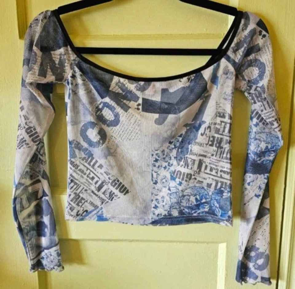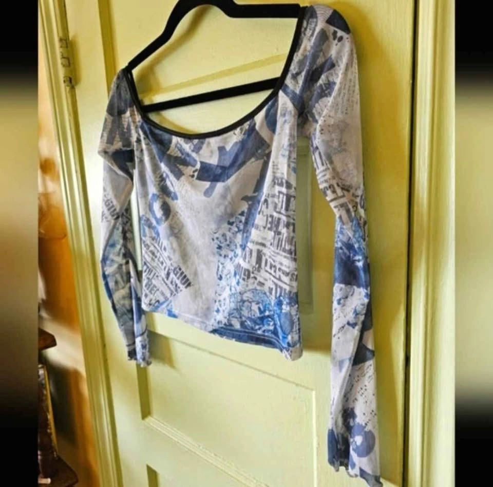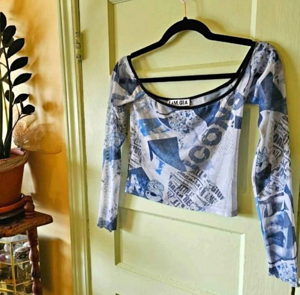 Cute Y2K 90s style cropped mesh long sleeve top from I.AM.GIA with lettuce hems at the sleeves and a wide boat neck. Blue all-over print of butterfly images and Italian newspaper prints. Top is in excellent used condition. Top measures 14" unstretched from pit to pit and stretches to 19". Sleeve length measures about 20" and length from shoulder to bottom hem measures about 15.5".