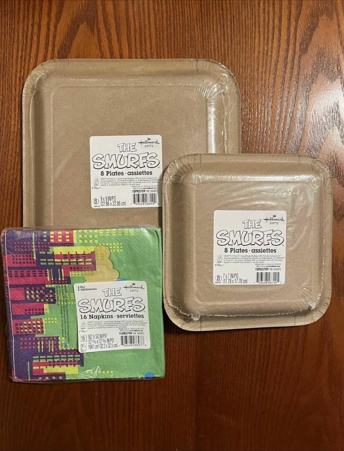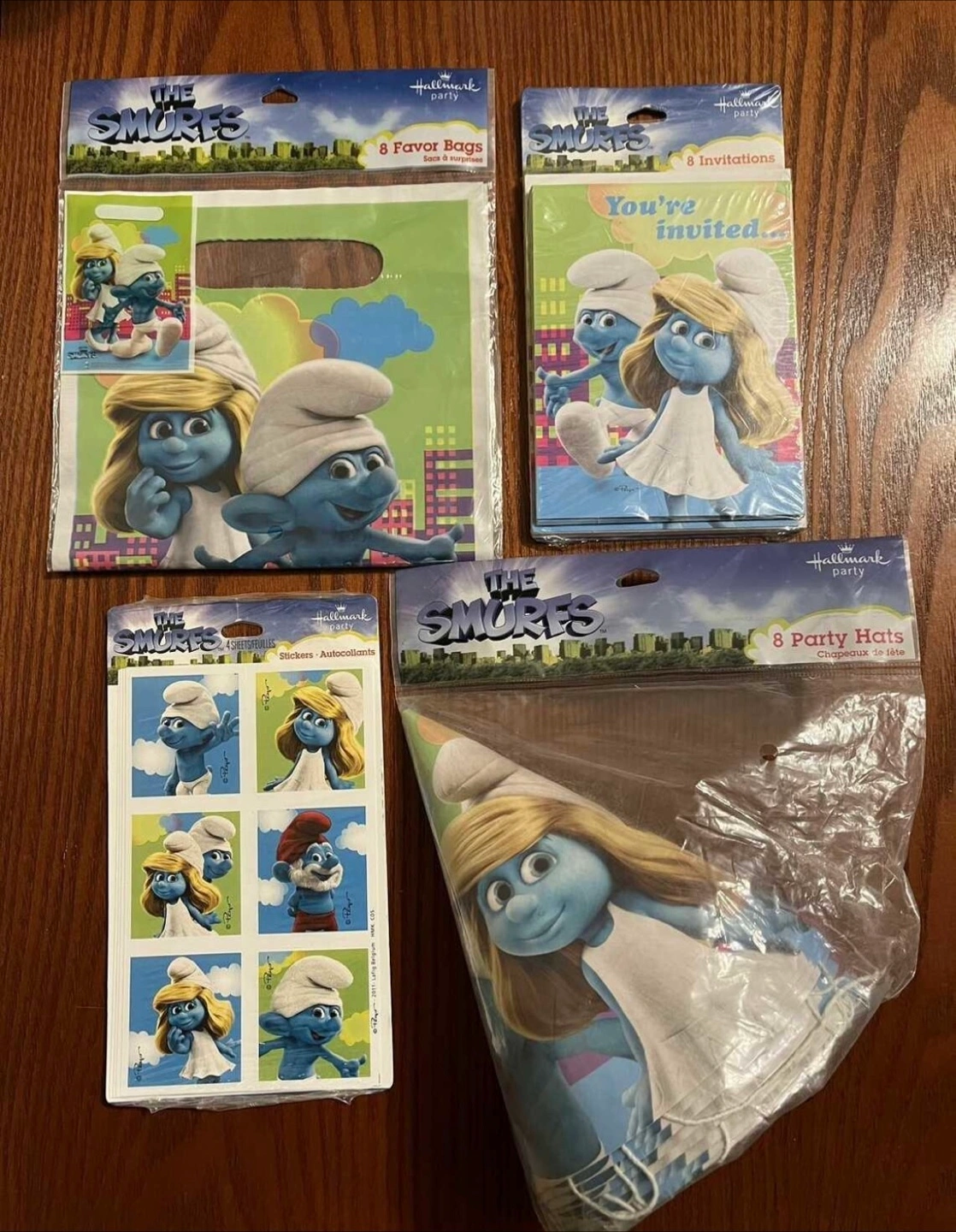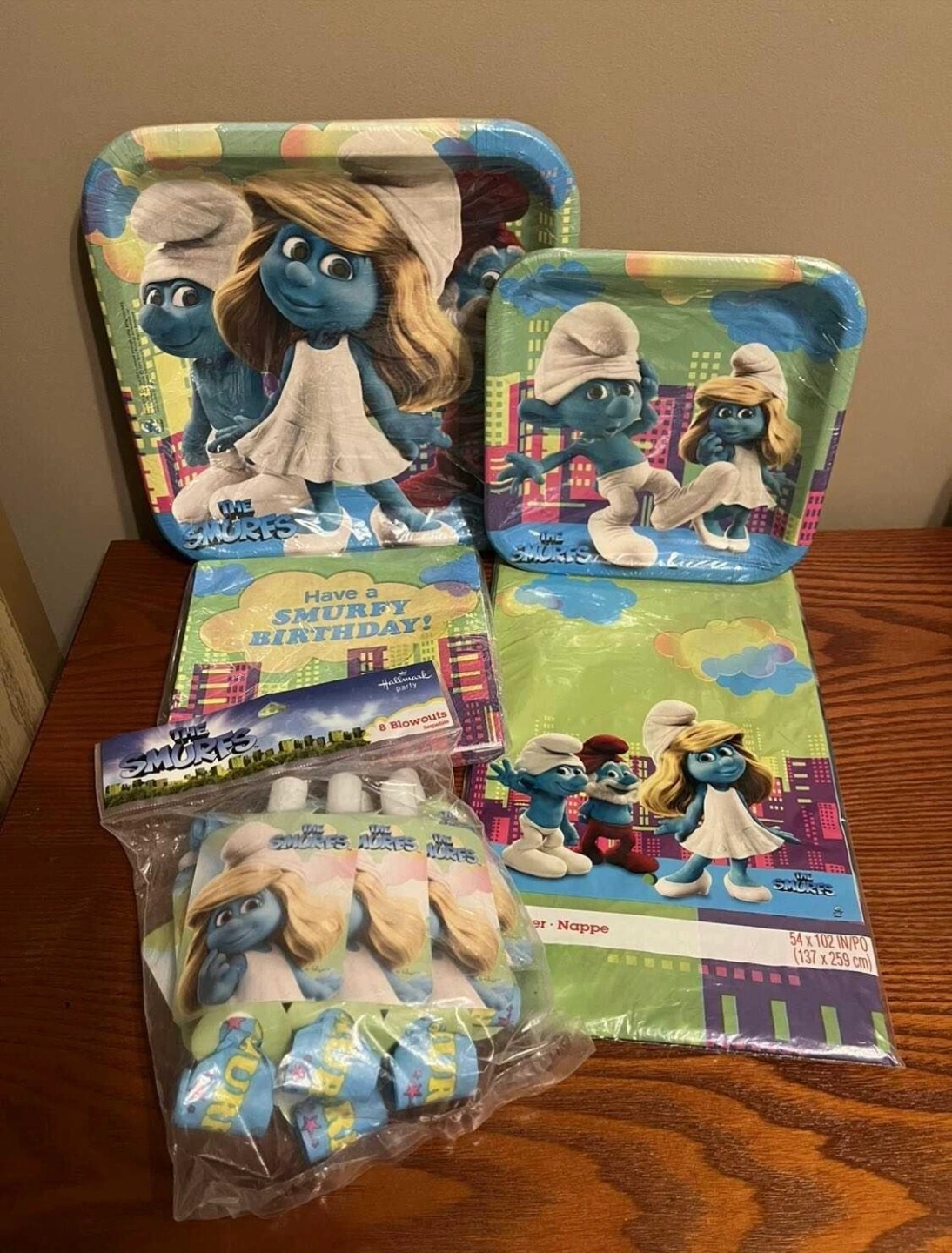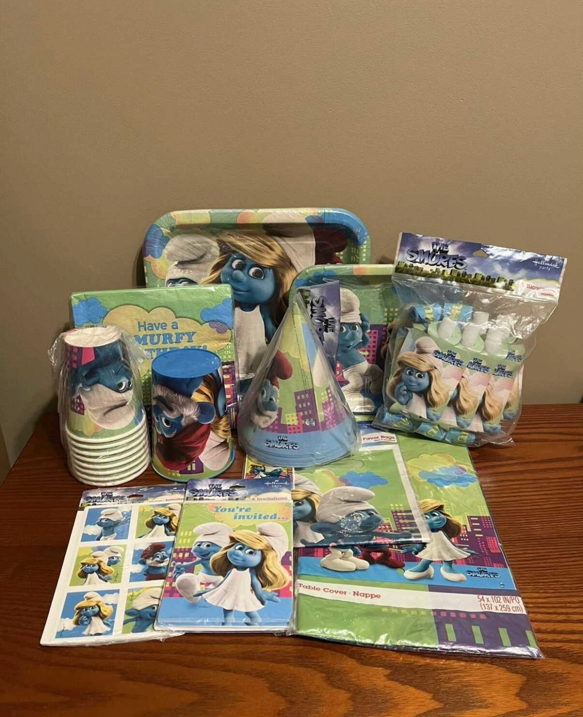 SMURF BIRTHDAY PARTY THEME BUNDLE BNIP Plates, napkins, blowers, hats, loot bags, invites, cups, table cover and stickers. Information is shown in the pictures. Selling all together for $13. Cross posted.