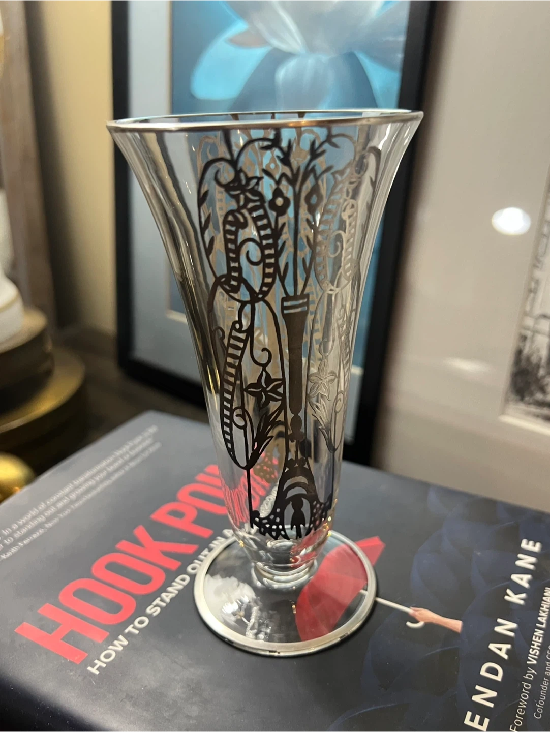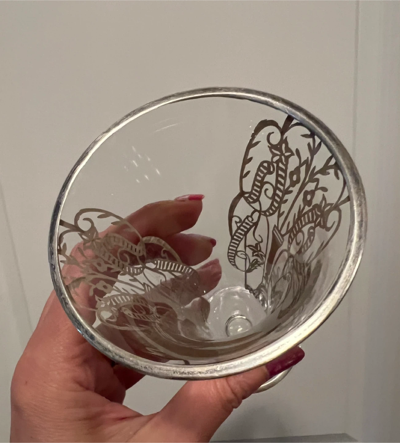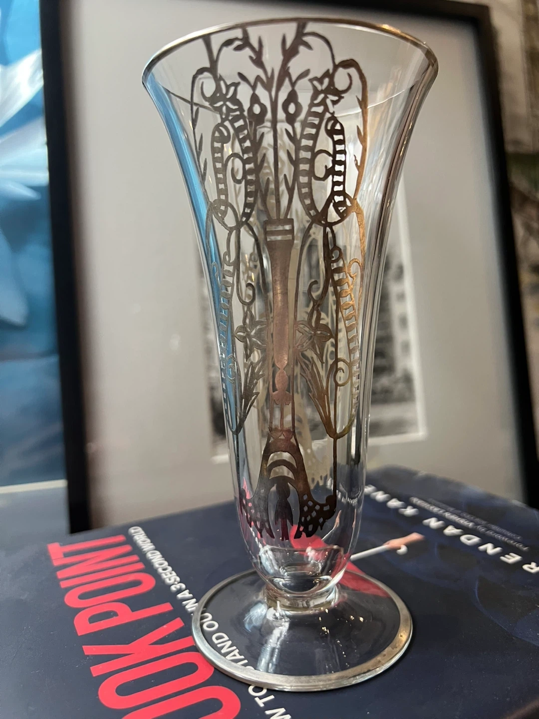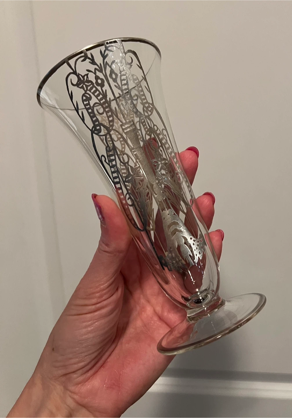 Vintage glass bud vase Silver overlay floral design in the front and back 6.5” tall 3” across opening Great condition Asking $5 Interested? Message me and please check my other listings…