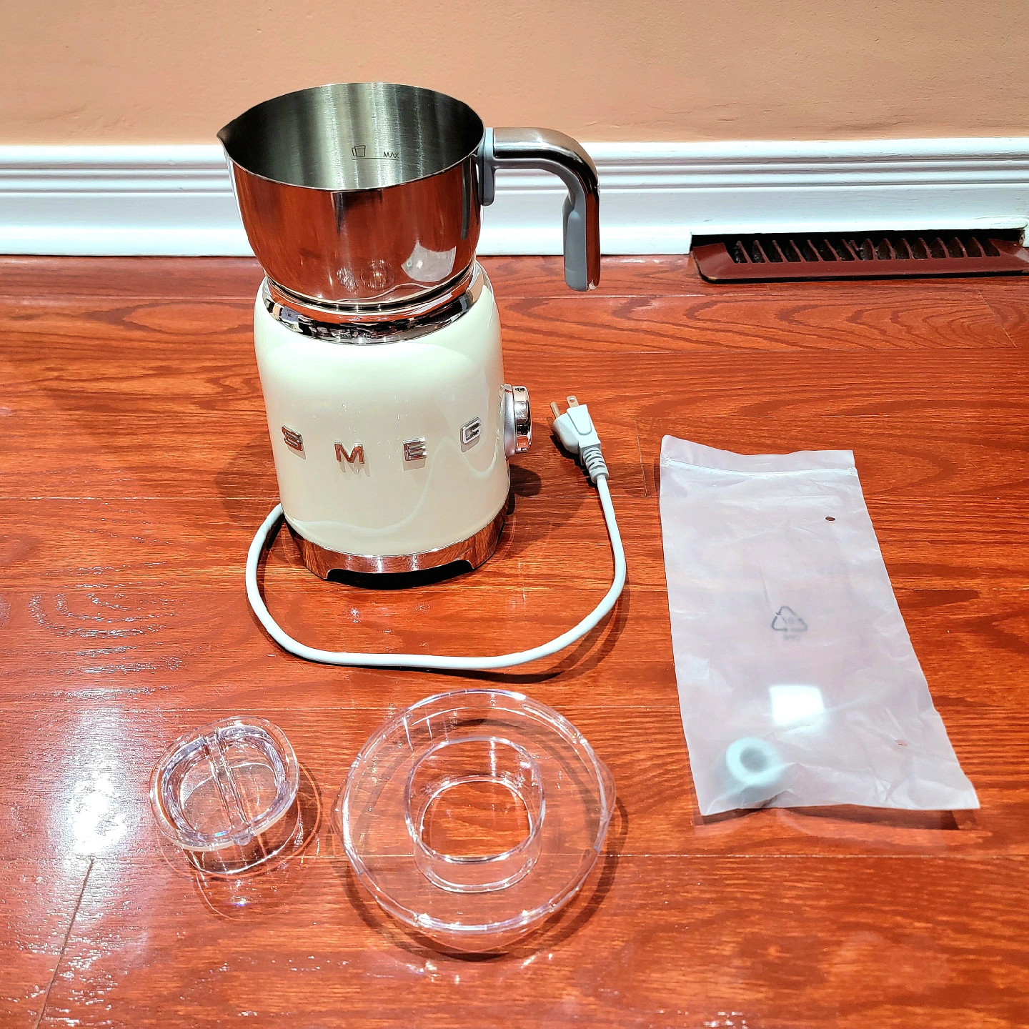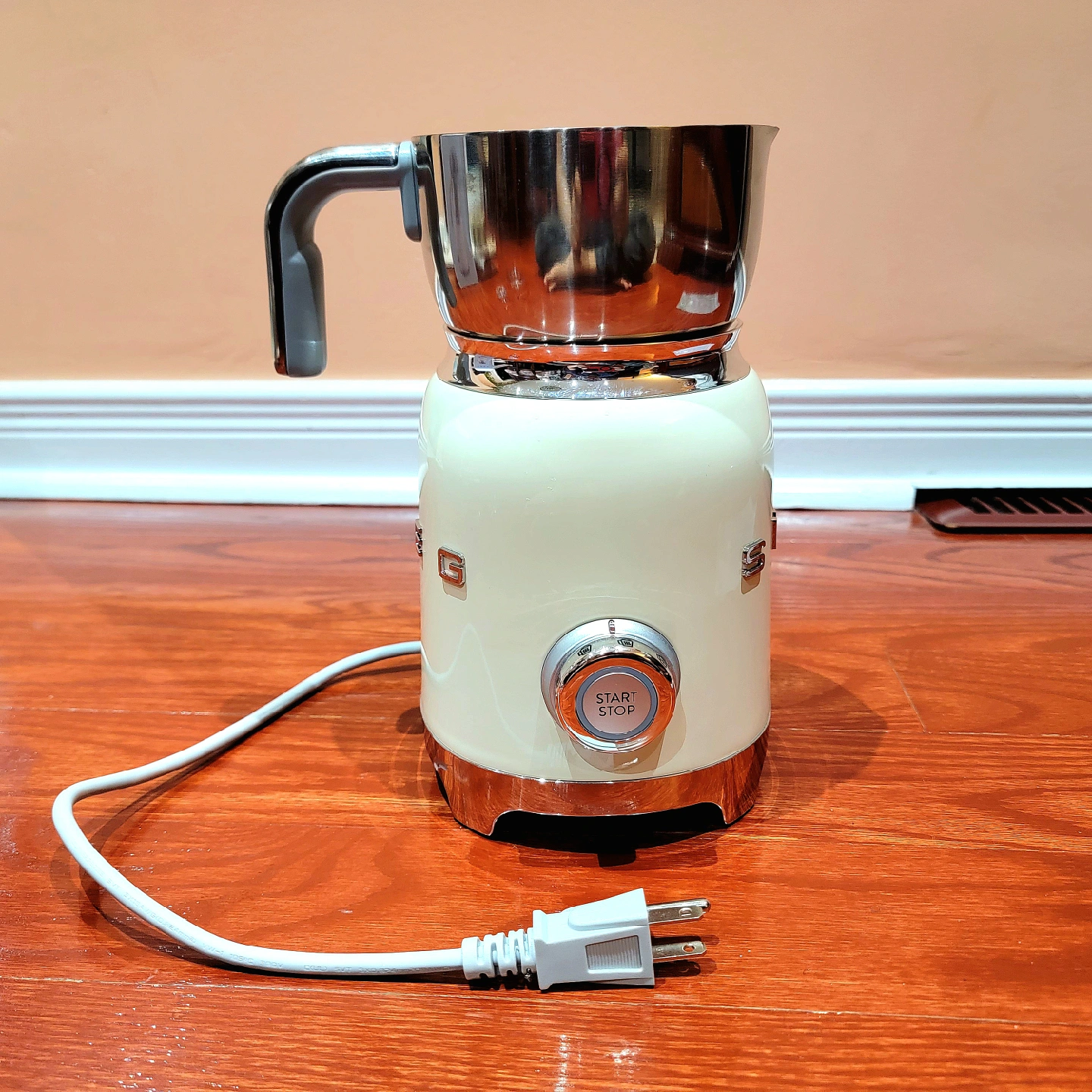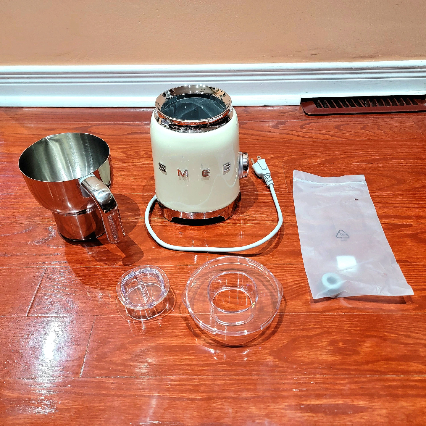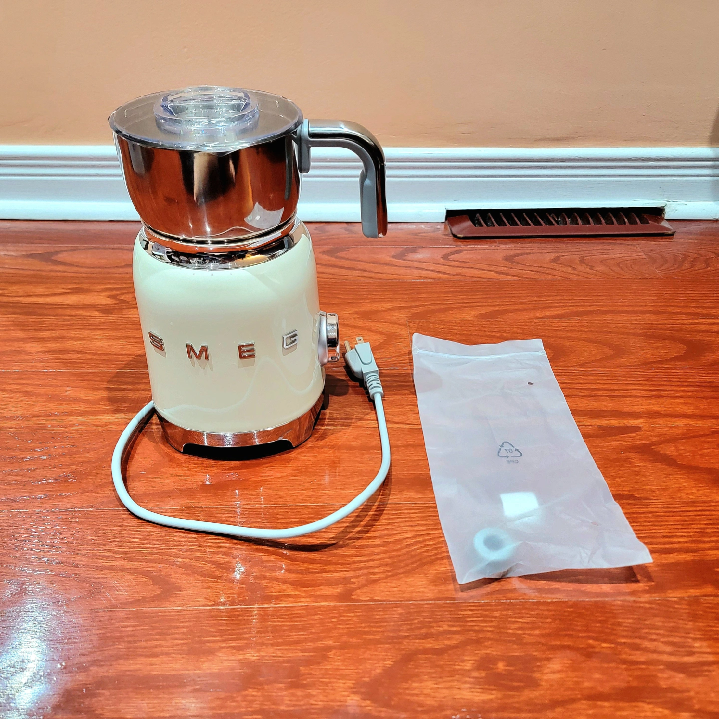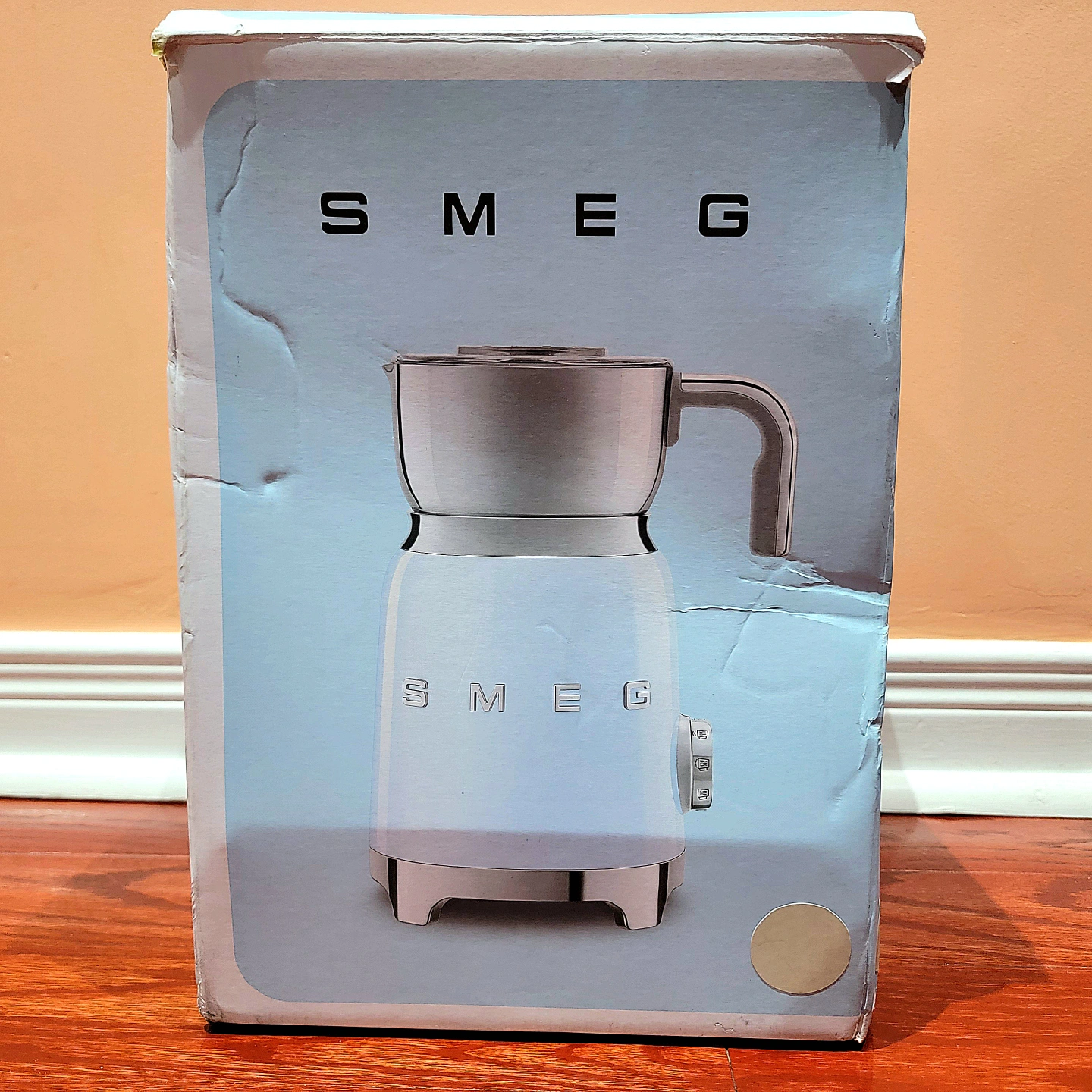 Add a touch of vintage & modern charm to your kitchen with the SMEG 50’s Retro Style Milk Frother. Perfect for coffee lovers, this frother creates smooth, creamy foam for cappuccinos, lattes, and hot chocolates at home. With multiple functions for both hot and cold frothing, you can enjoy café-quality drinks anytime. The sleek 1950s-inspired design not only looks stylish on your counter but also delivers reliable performance and ease of use. The Milk Frother is NEW and NEVER USED. Everything is original. Opens to offers. They sell for $335 on Amazon. ALL THE FEATURES: Model: MFF01CRUS (Cream Color) Auto Shut-Off, Detachable Base, See-Through Lid, Variable FrothSetting, Stainless Steel, Comes with a removable stainless-steel jug for easy pouring and cleaning, Quickly heats milk to your desired temperature, 6 settings, Choose between hot or cold milk with light or thick foam settings, Features a user-friendly control panel with a backlit knob for easy adjustments, Anti-slip feet provide stability during use, 120 Volts, 907g weight, 567 g capacity, 500 Watts, corded electric, can be hand washed, can be used in a dishwasher. INCLUDED COMPONENTS: 1 SMEG Frother (built-in cord), 1 stainless steel metal cup, 2 Lids.