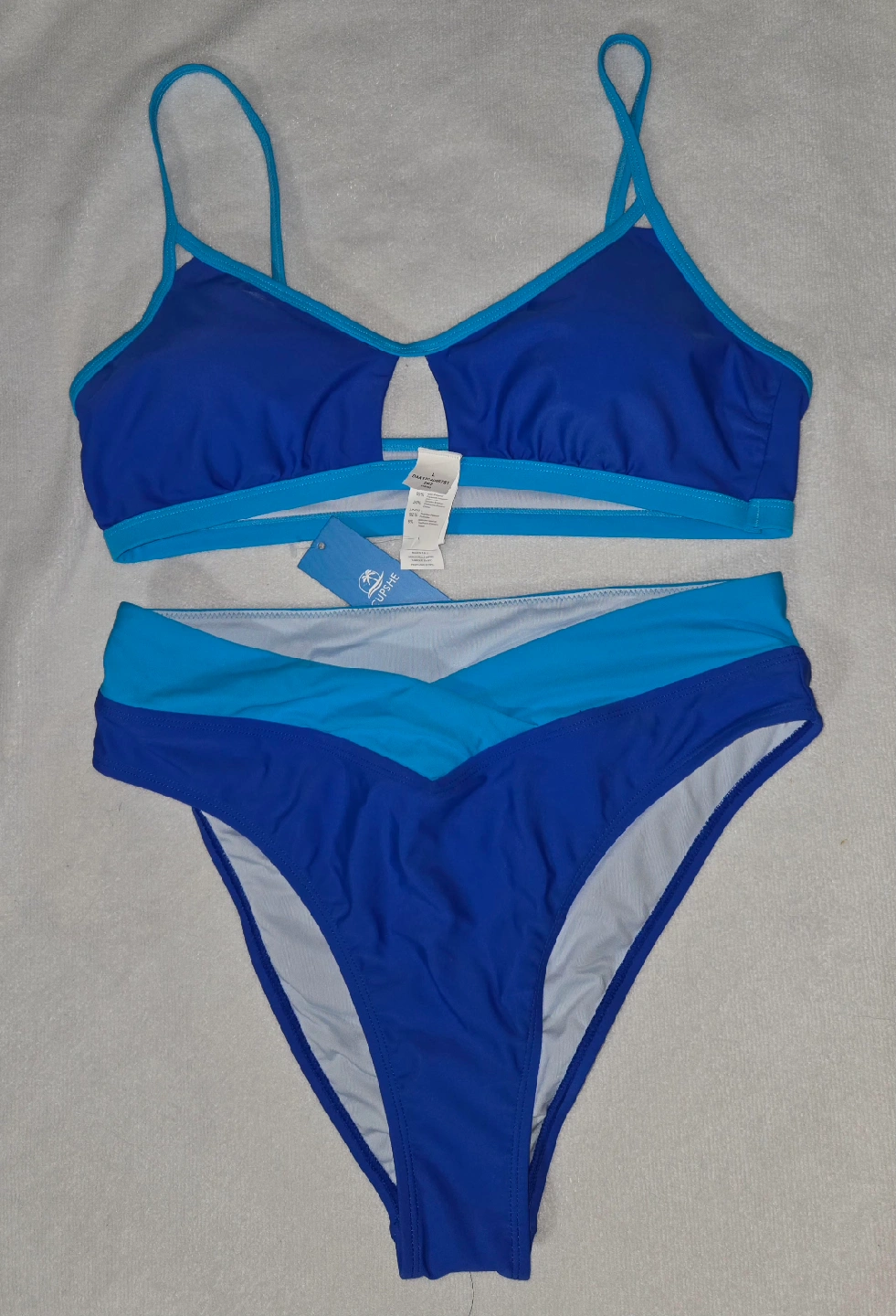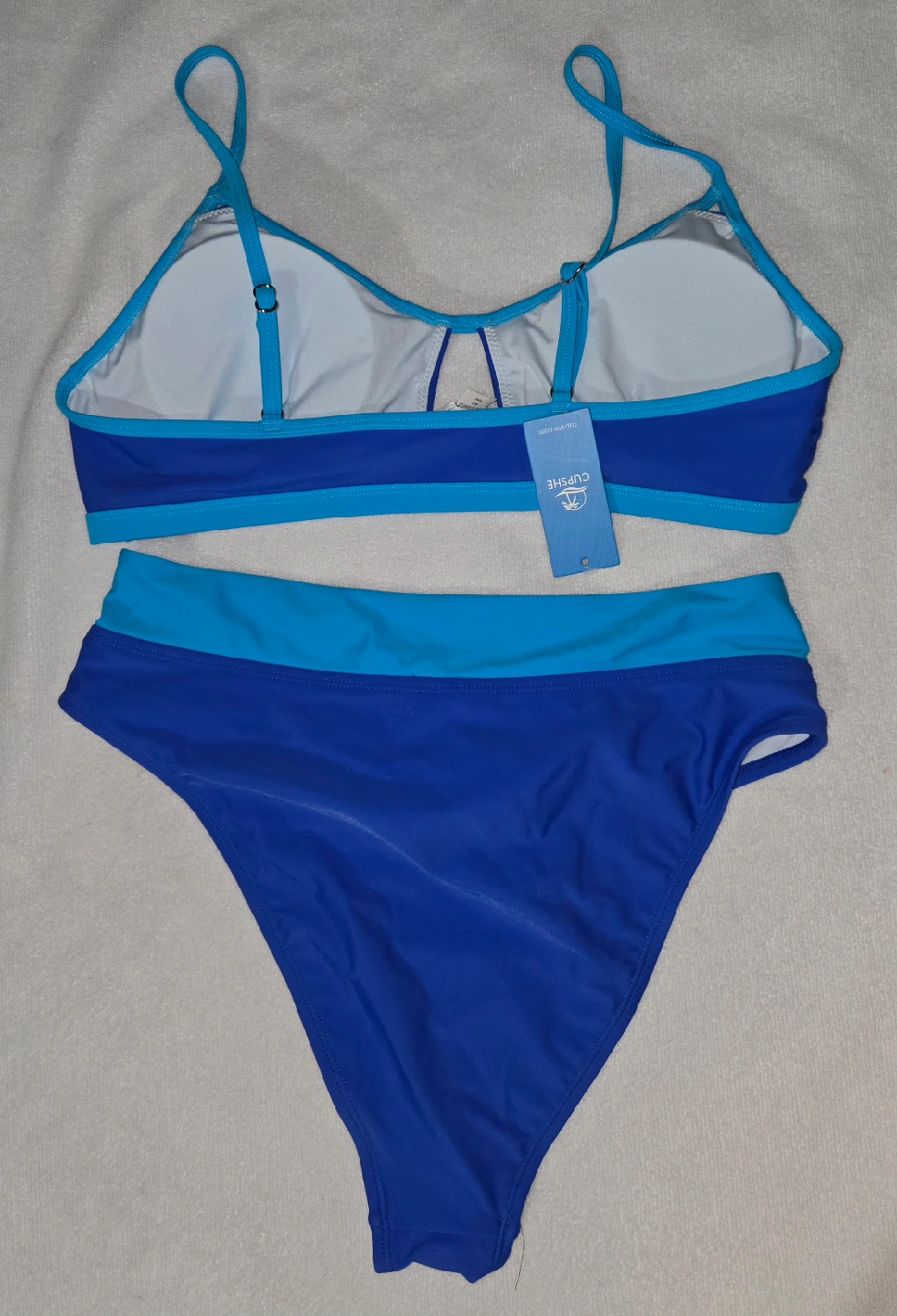 This CUPSHE two-piece bikini is perfect for your next beach day! The swimsuit features a stylish design with a blue colour scheme.