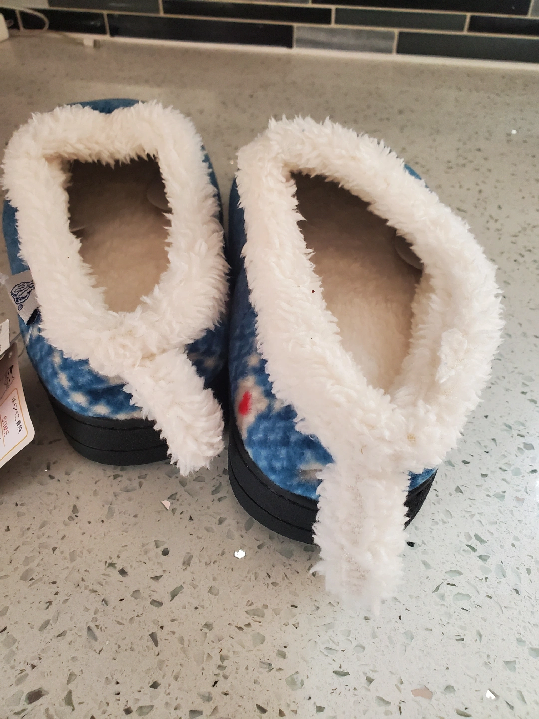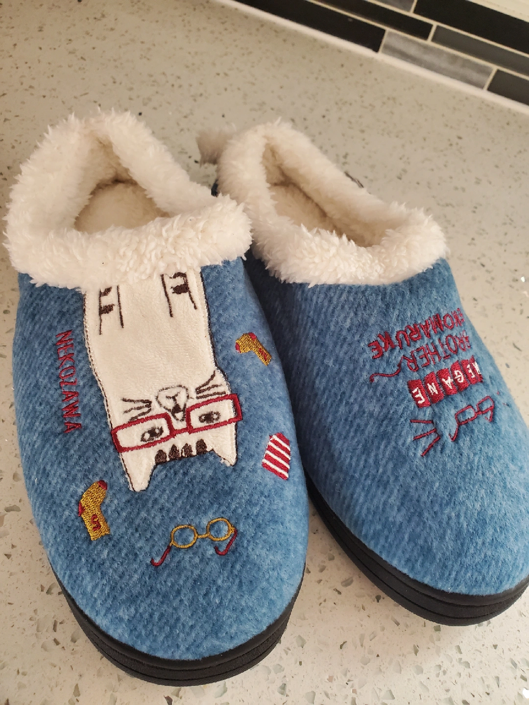 These adorable blue slippers feature a cute cat design and cozy white faux fur lining! They're a European size 40-41, which is approximately a US women's size 9-10. Perfect for keeping your feet warm and comfy around the house! They fit like size 8 to 9