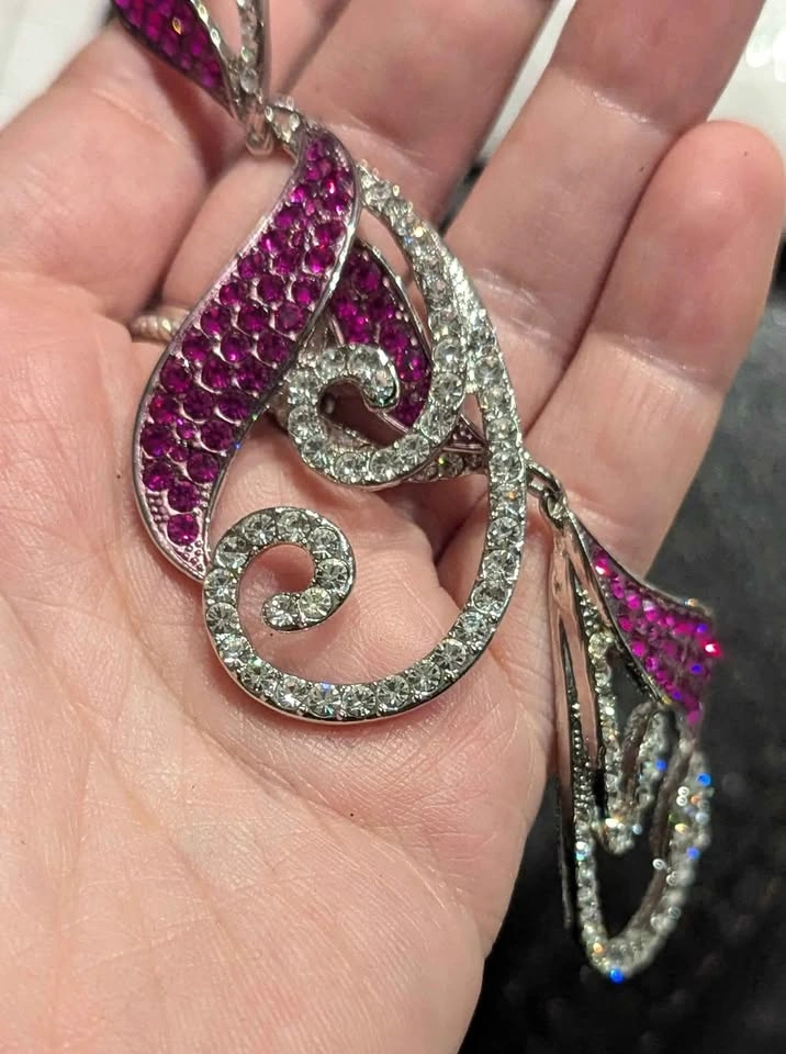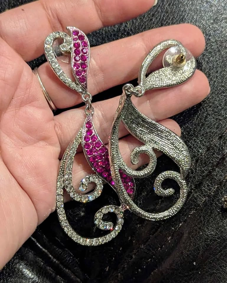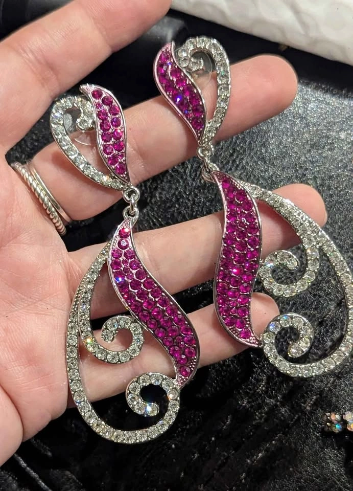 Worn once for a show. Stunning extra-large rhinestone statement earrings. Silver-tone metal with sparkling clear & deep pink stones in a swirling paisley-inspired design. Dramatic drop length β perfect for parties, performances, or a glamorous night out. Lightweight for their size, secure post backs. Approx. length: 4.5" π Condition: Excellent, all stones intact and full of sparkle.