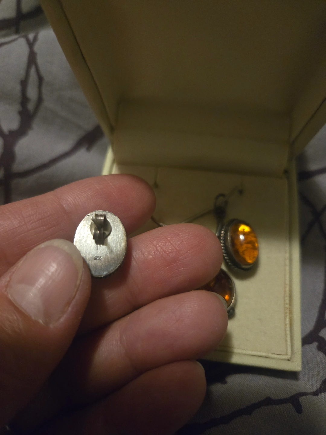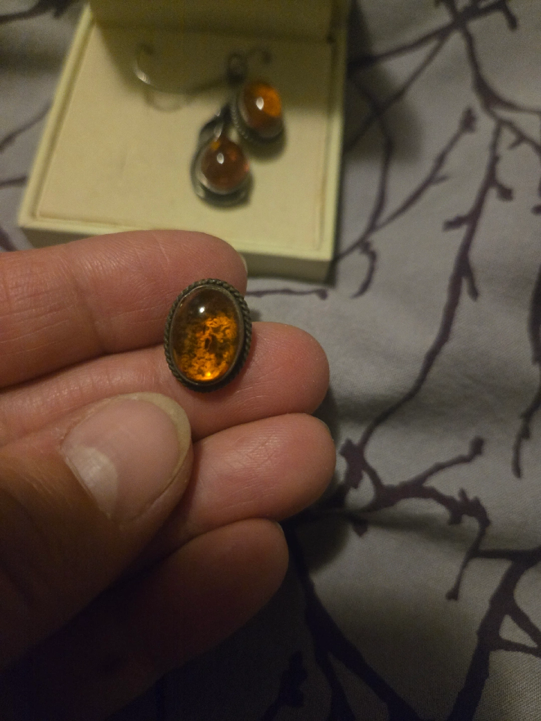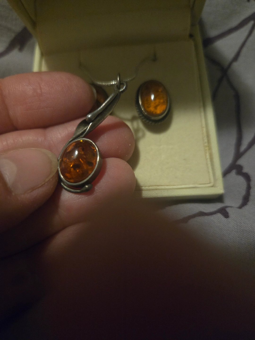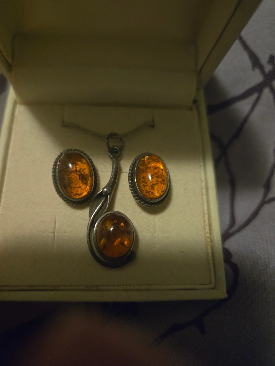 Beautiful amber pendant necklace with matching earrings set! Comes in a box, ready to wear or gift. The amber stones are a lovely warm colour, perfect for adding a touch of elegance to any outfit