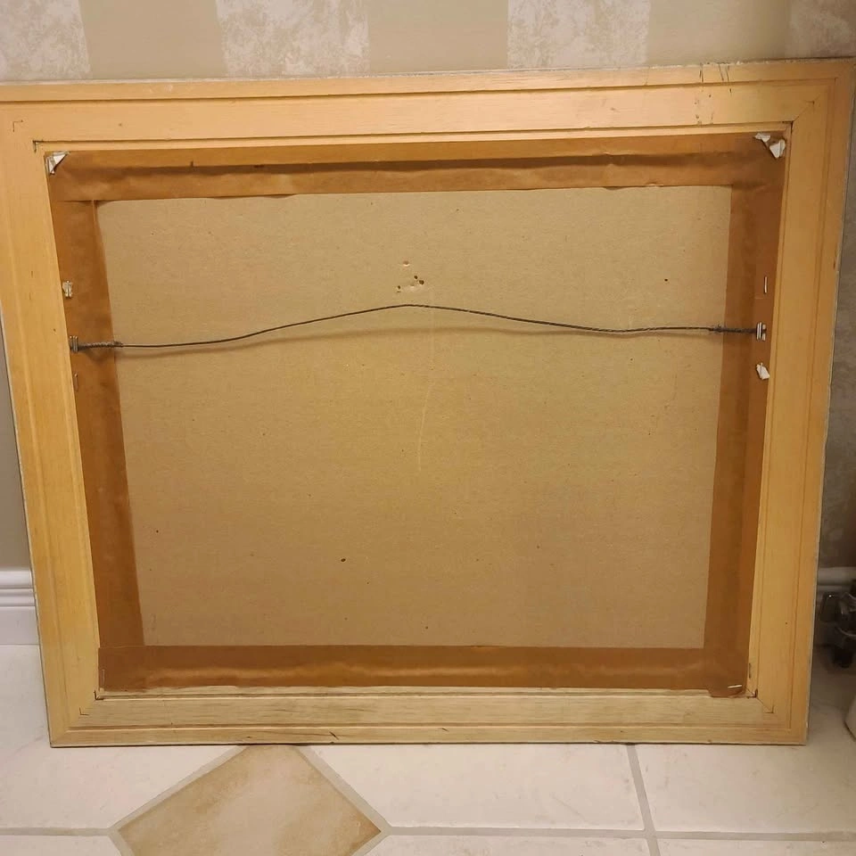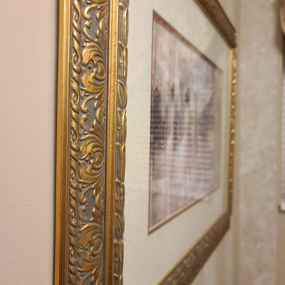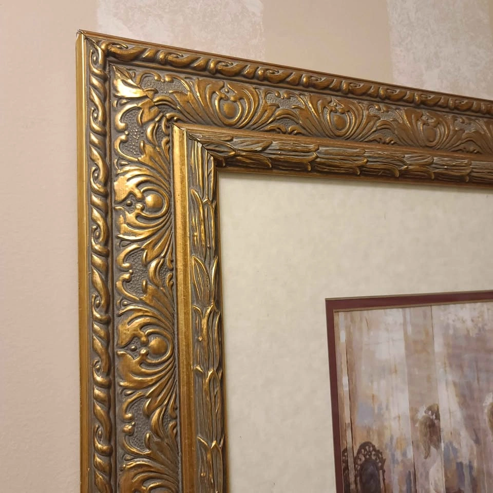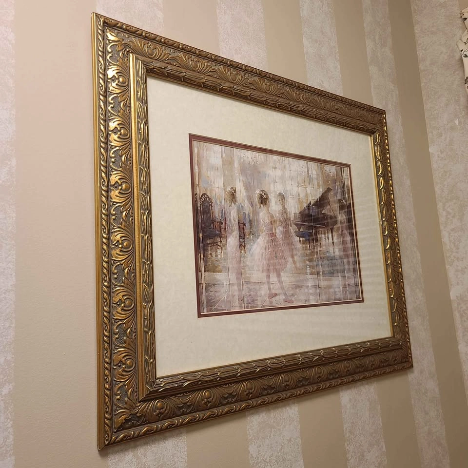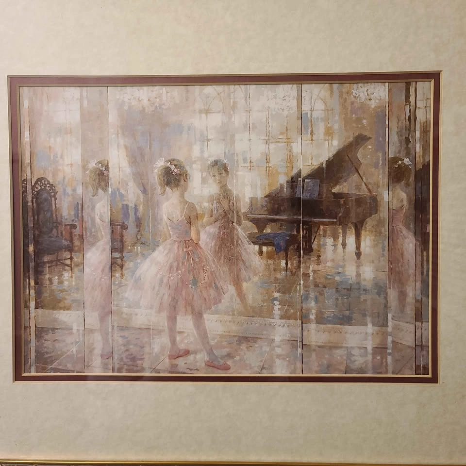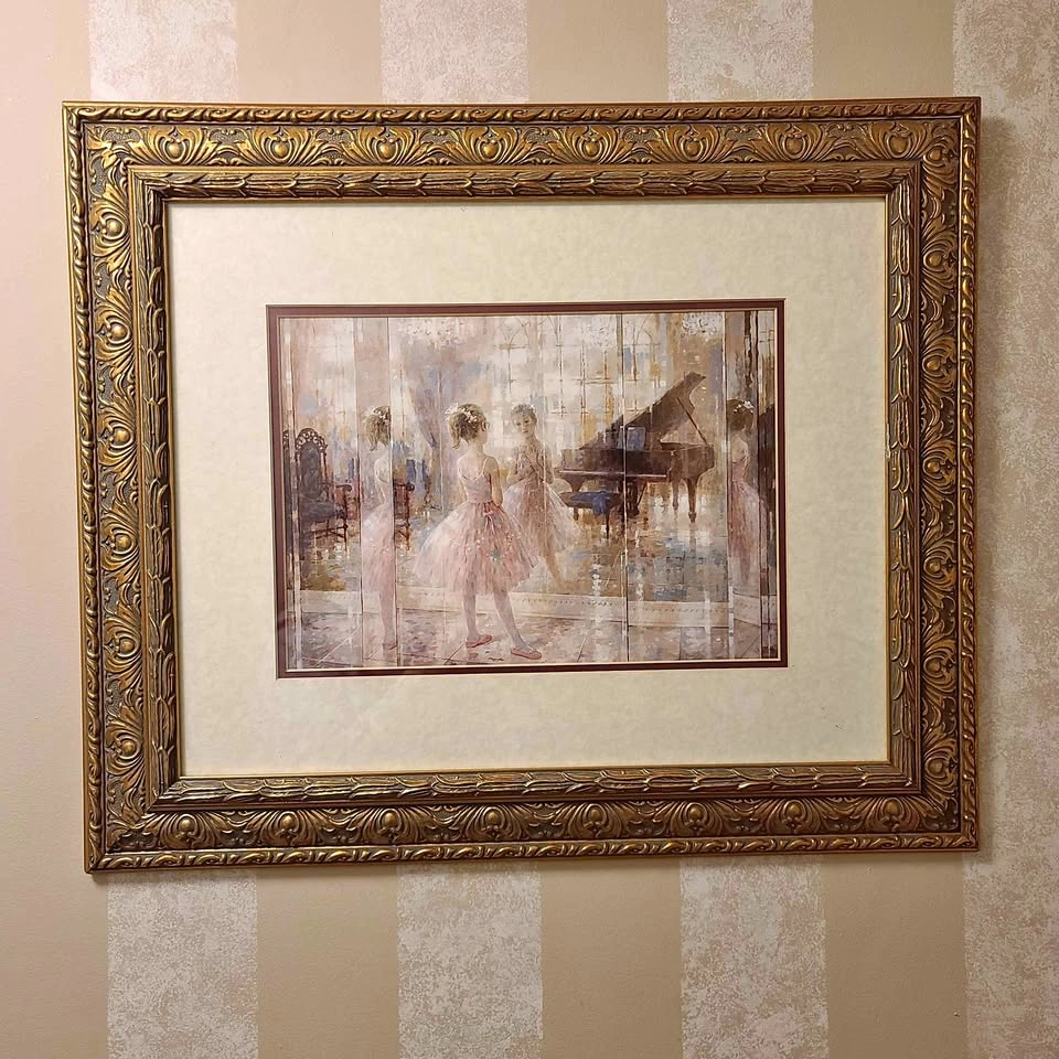 Stunning Romantic Ballet Print in Ornate Gold Frame! Features a graceful ballerina practicing in front of a mirror, with a piano softly reflected in the background Print opening from back: 16" × 20"; Overall frame size: 21" × 25" Stylish ornate gold-tone frame , solid wood, with detailed scroll-and-floral design; cream double-mat with a burgundy border - protective glass over top Ready to hang with sturdy wire on the back; excellent vintage condition no noticeable flaws.