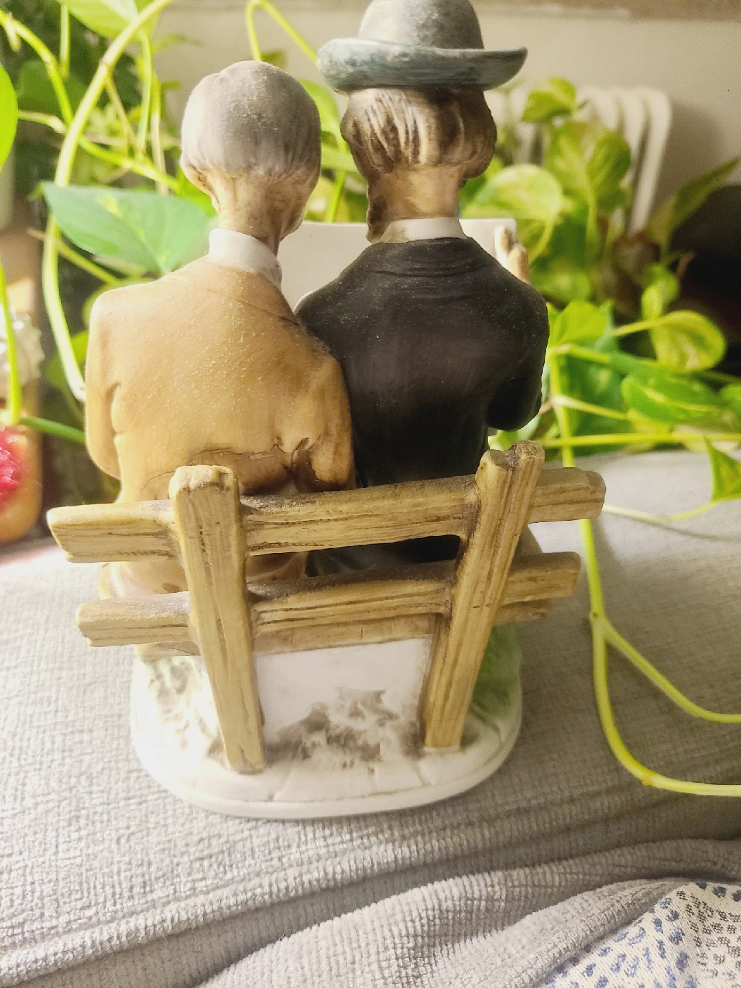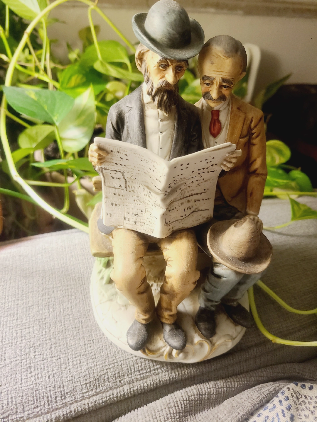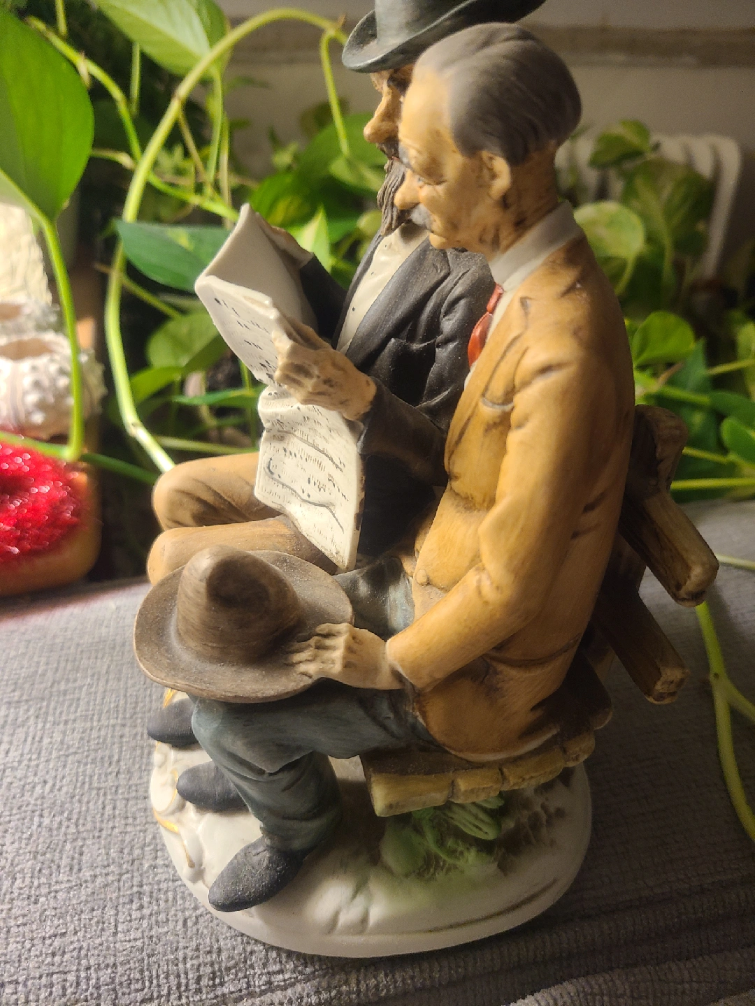 I'm selling a vintage figurine depicting two men sitting on a bench reading a newspaper. It's a charming piece, perfect for adding a touch of nostalgia to your home. The figurine is marked "Japan" on the bottom. it is 8" T.