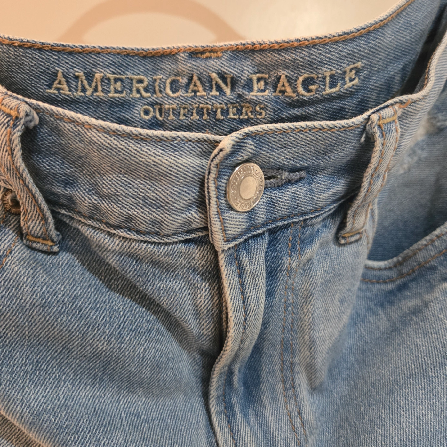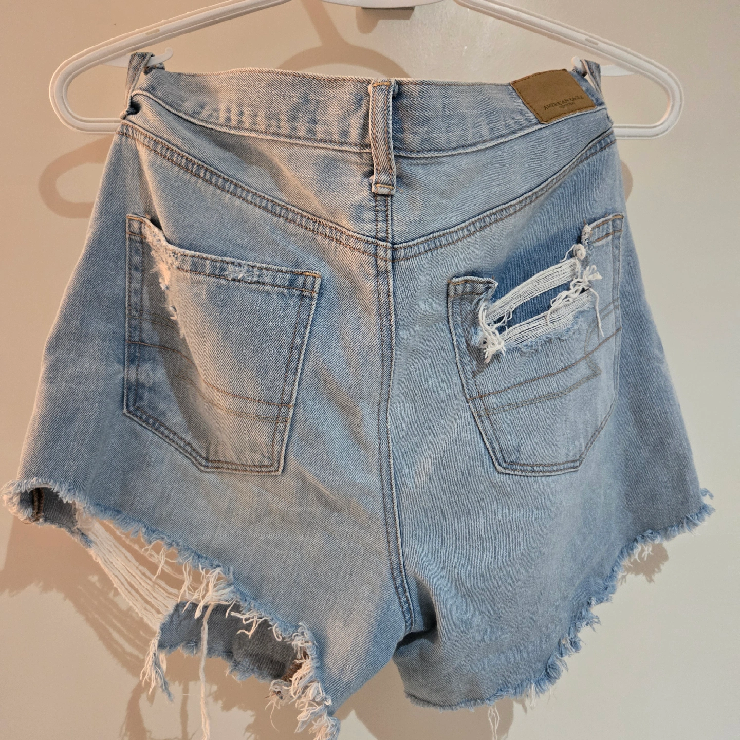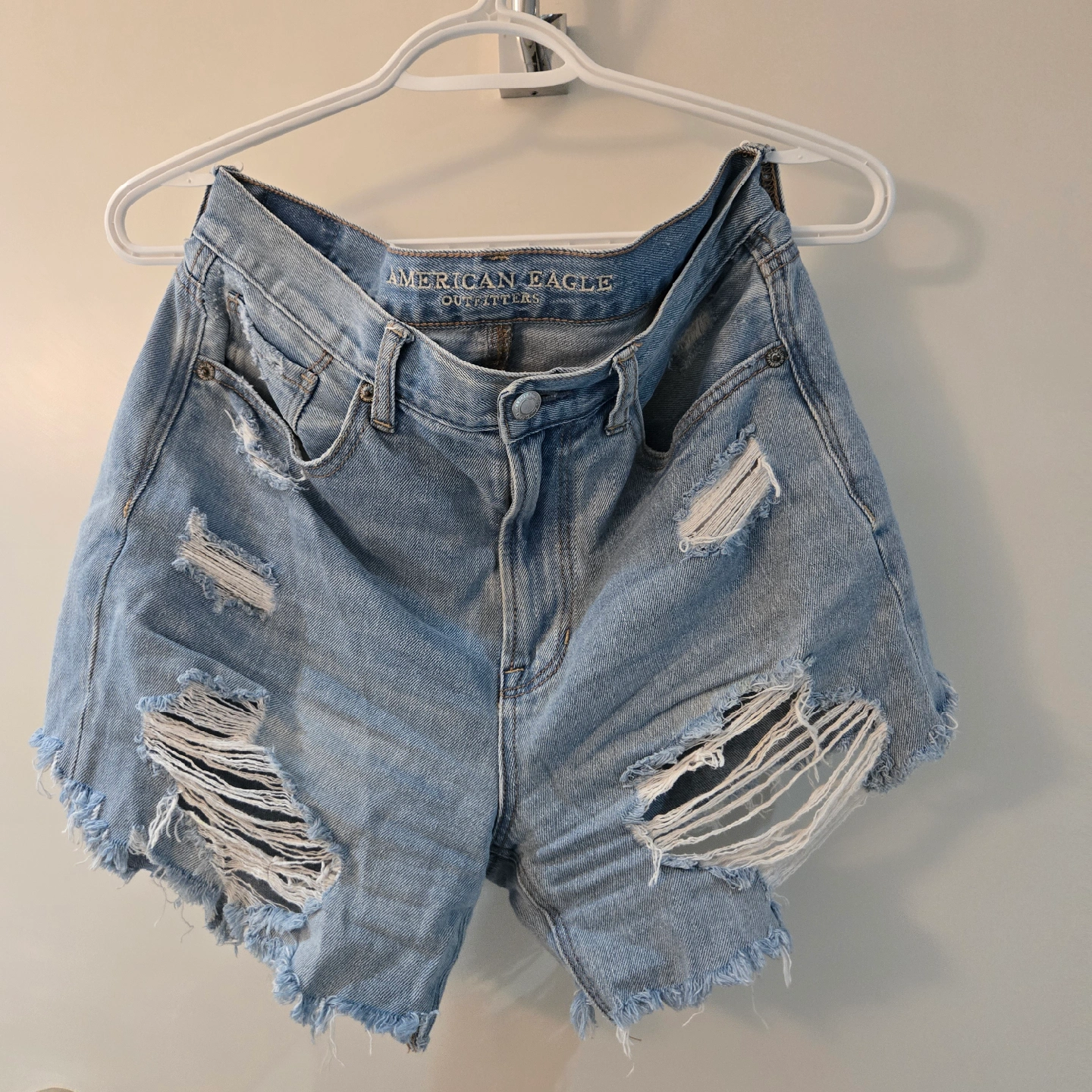 Selling a pair of American Eagle denim shorts in size 8. These shorts feature a distressed design with rips and frayed edges. They're super comfy and a great addition to your wardrobe!