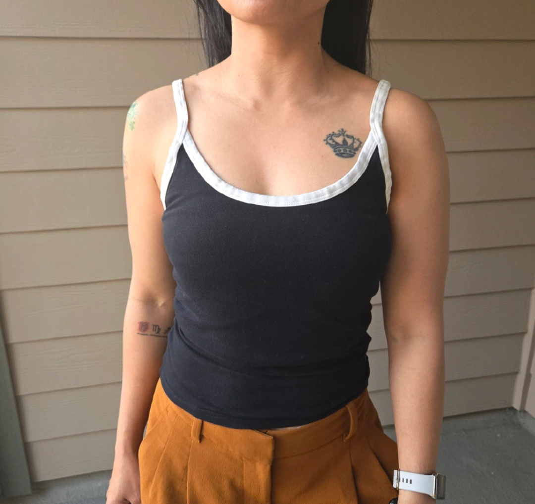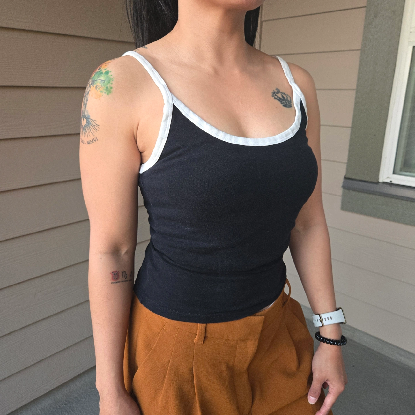 A simple and stylish black tank top with white trim. It's in great condition and ready for a new home! Perfect for layering or wearing on its own.