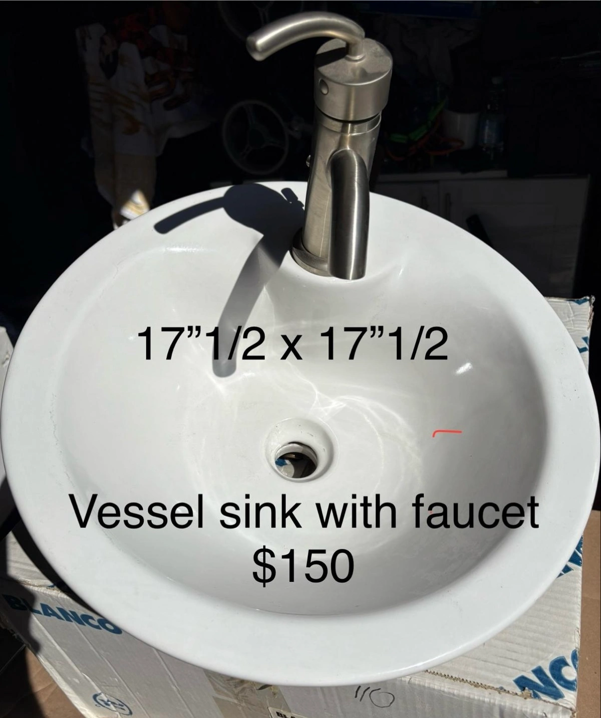 Selling a new vessel sink complete with a faucet. It measures 17 1/2 inches by 17 1/2 inches. Asking $150.