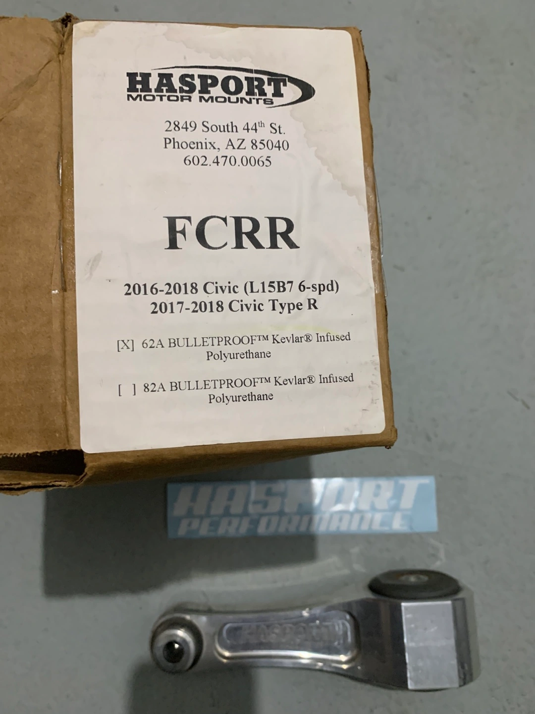 Selling a Hasport FCRR motor mount. It fits 2016-2018 Civic (L15B7 6-spd) and 2017-2018 Civic Type R models. The mount features 62A Bulletproof Kevlar infused polyurethane. Box and sticker included!
