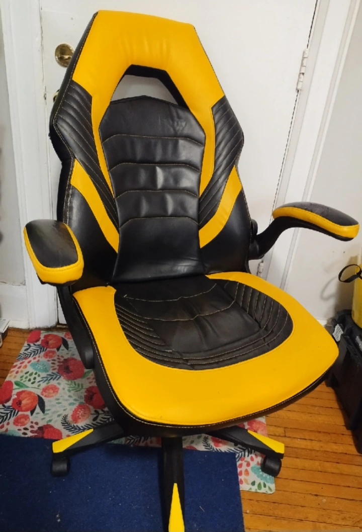 Selling a black and yellow gaming chair. It has some signs of wear, as you can see in the photos, especially on the armrests. There has been some cat interference, small claw marks on the seat. Sold as-is, cash only, final sale, must come pick up (probably need vehicle)