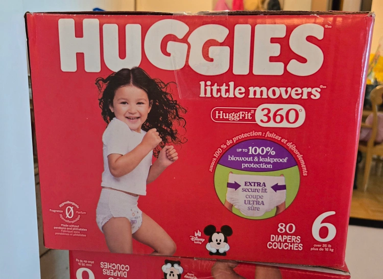 Selling a box of Huggies Little Movers diapers, size 6. These are designed with HuggFit 360° for a secure and comfortable fit. They offer up to 100% blowout and leakproof protection, so you can be confident your little one stays dry. Each box contains 80 diapers, suitable for babies over 35 lbs (16 kg).