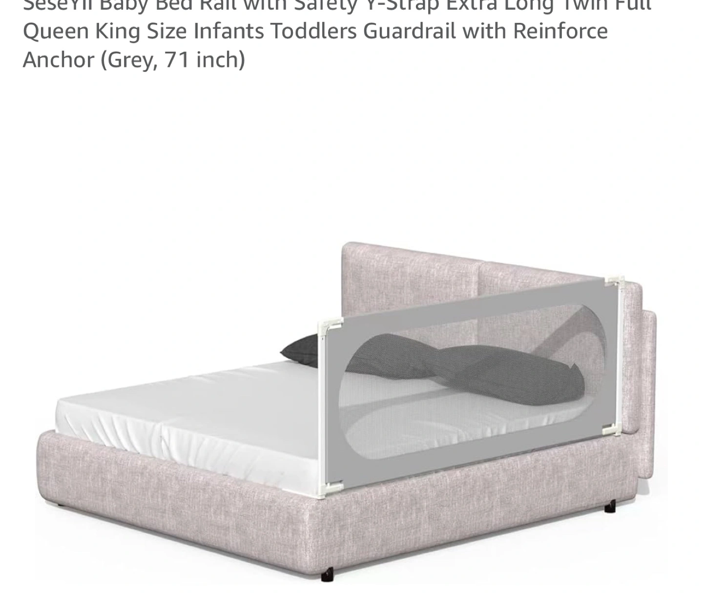 Selling a Seseyi baby bed rail, perfect for keeping your little one safe! It features a safety Y-strap and is extra long, suitable for twin, full, queen, and king size beds. The guardrail has a reinforced anchor and comes in grey, measuring 71 inches